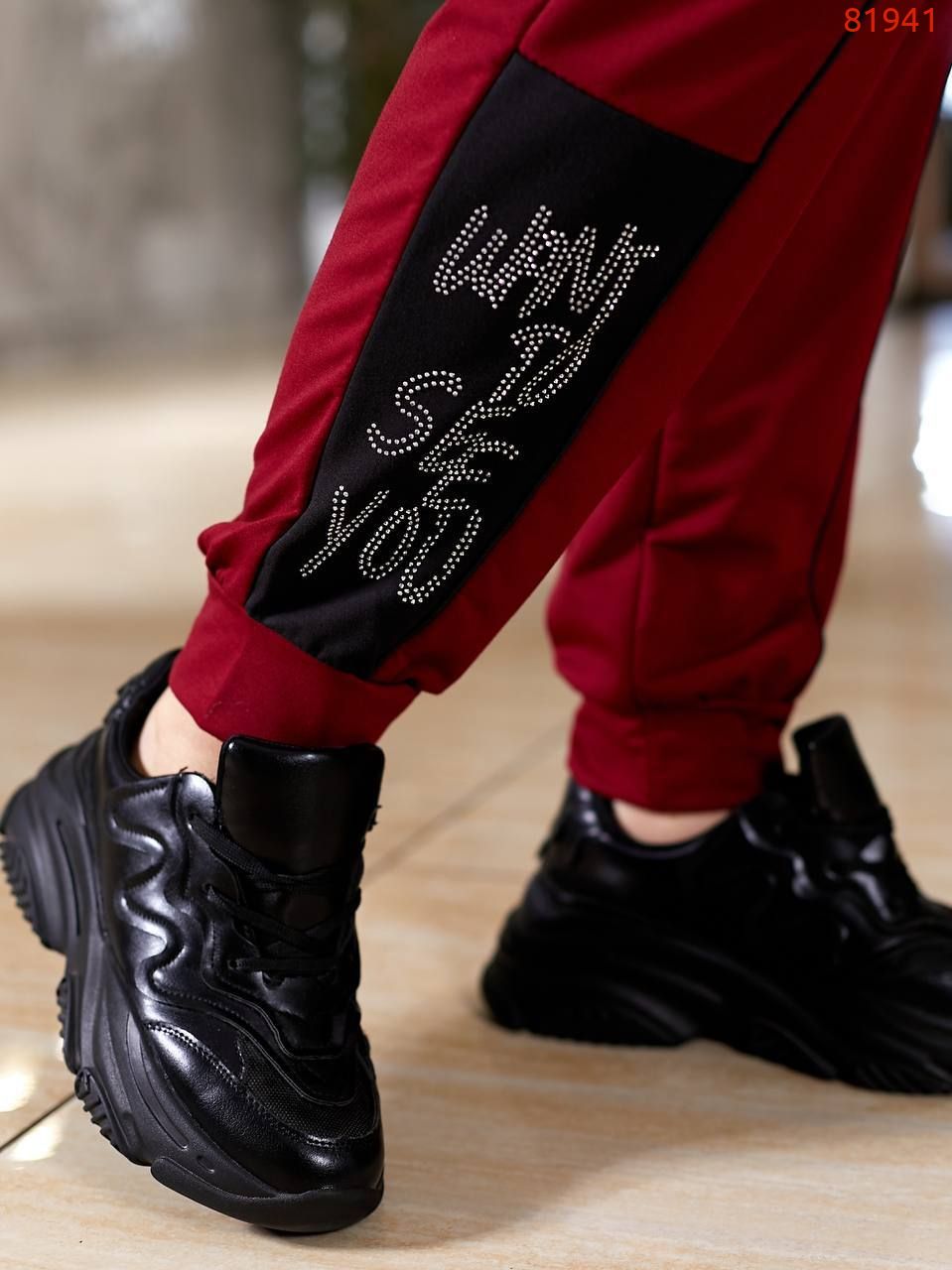 Штани з високою посадкою, декоровані камінням, пояс гумка 4 см, кишені