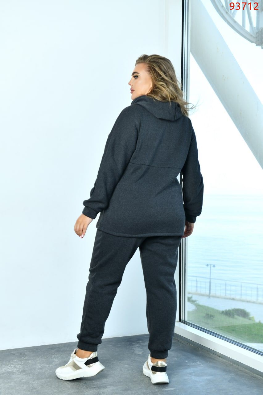 Неймовірно зручний та теплий костюм для прогулянок із трикотажу з начосом (розтяжність середня). Куртка вільного силуету, рукав цільновикроєний, на манжеті. Застібається на блискавку. В куліску капюшона протягнуто шнурок. Попереду оброблені прорізні кишені. Штани з високою посадкою, по талії зібрані на резинку, низ на манжетах, в бічних швах оброблені кишені.