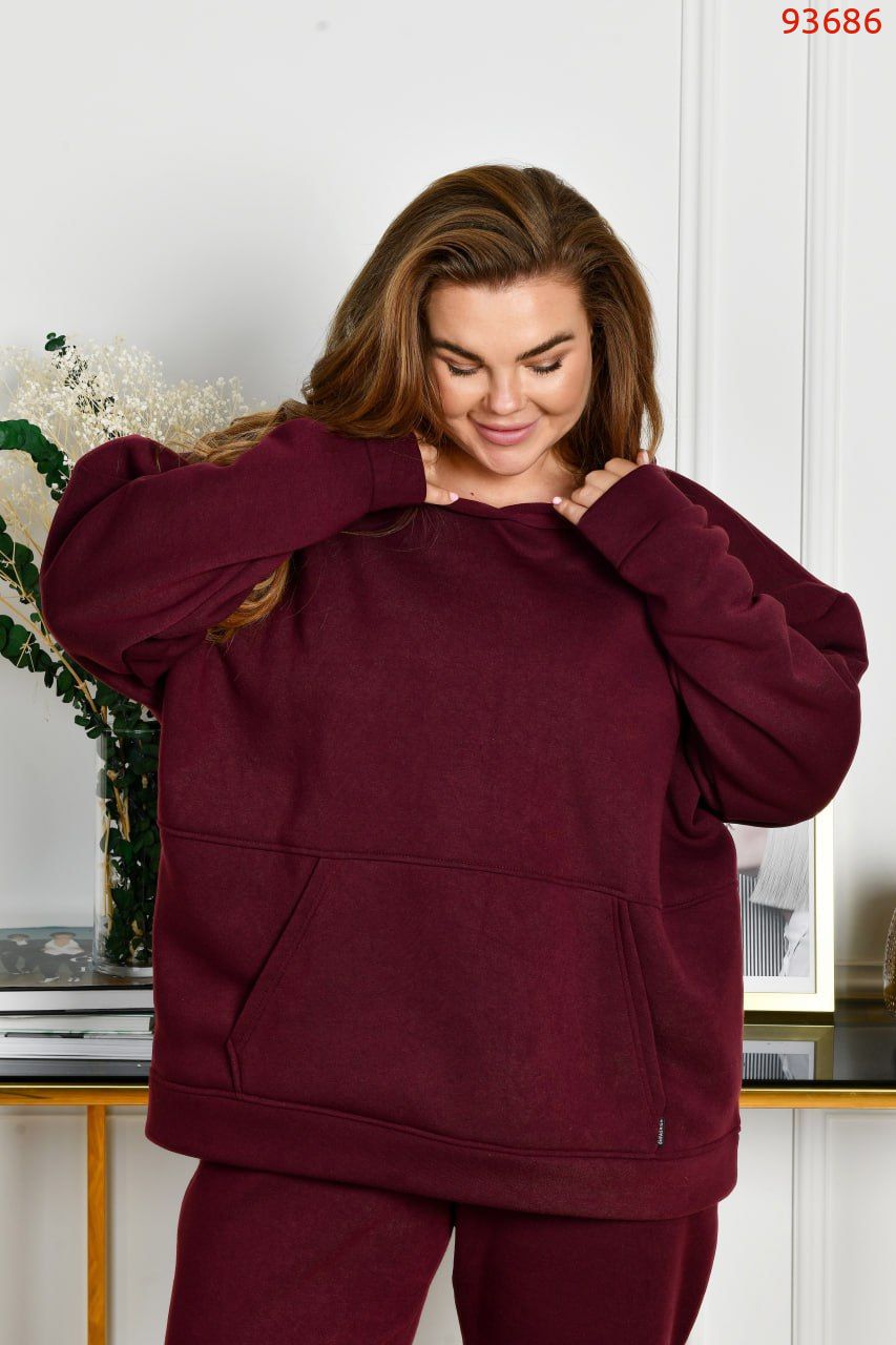 Худі з капюшоном, силует прямий вільний. Лінія плеча спущена. Рукави на манжетах. На передній полочці кишеня «кегуру».