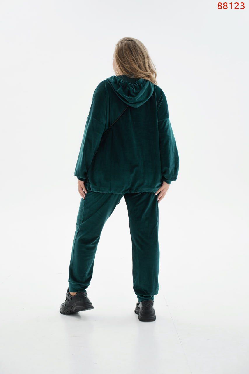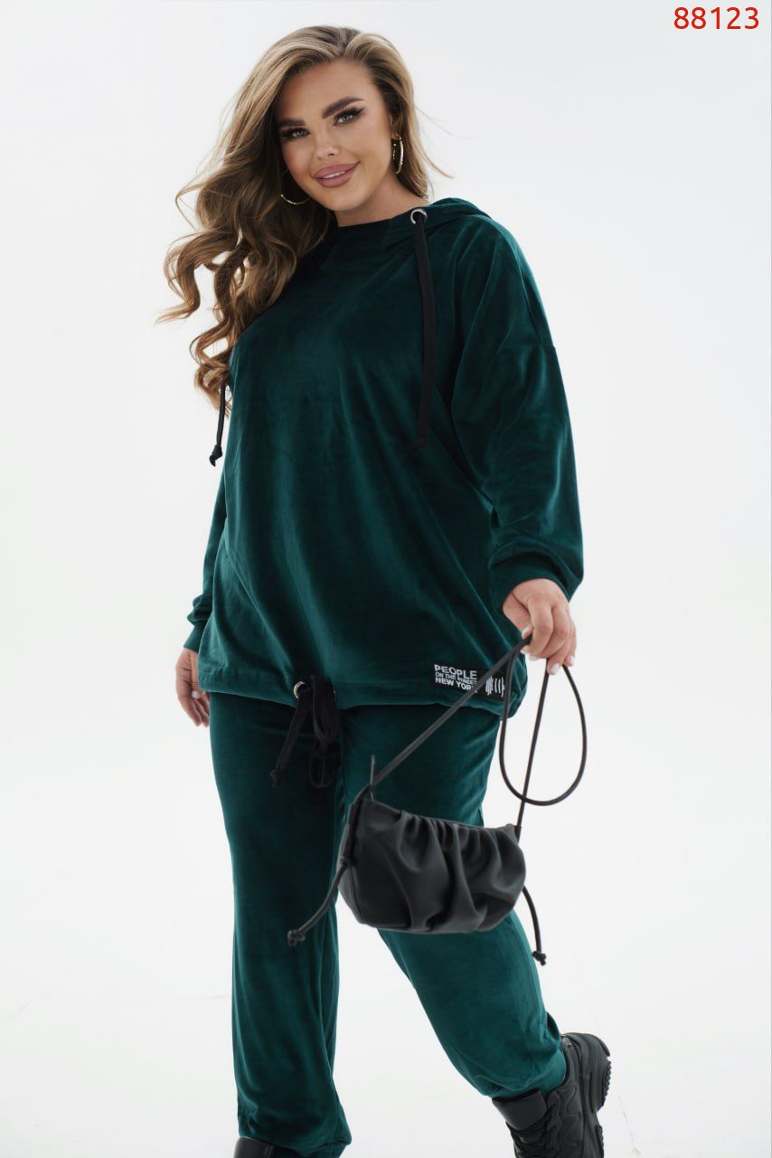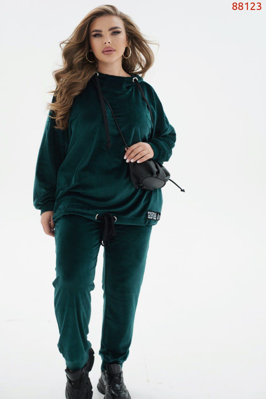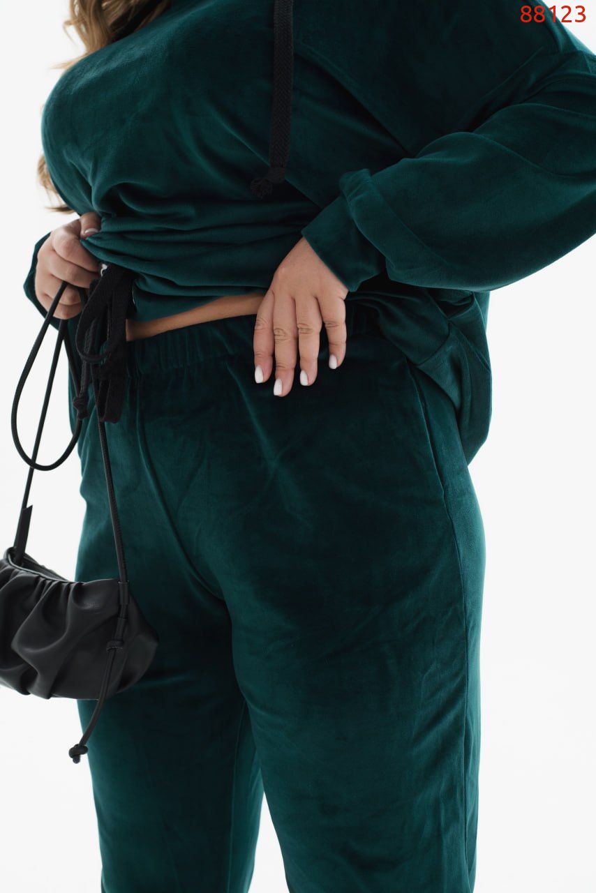 Яскравий спортивний костюм, що виконаний з м'якого велюру, стане улюбленою річчю для жінки, яка цінує практичність і не забуває про модні тенденції. У комплект входять лаконічні штани-джогери на резинці з кишенями і манжетами, а також комфортне худі, доповнене довгими рукавами з приспущеною лінією плечей і капюшоном з шнурком і люверсами.