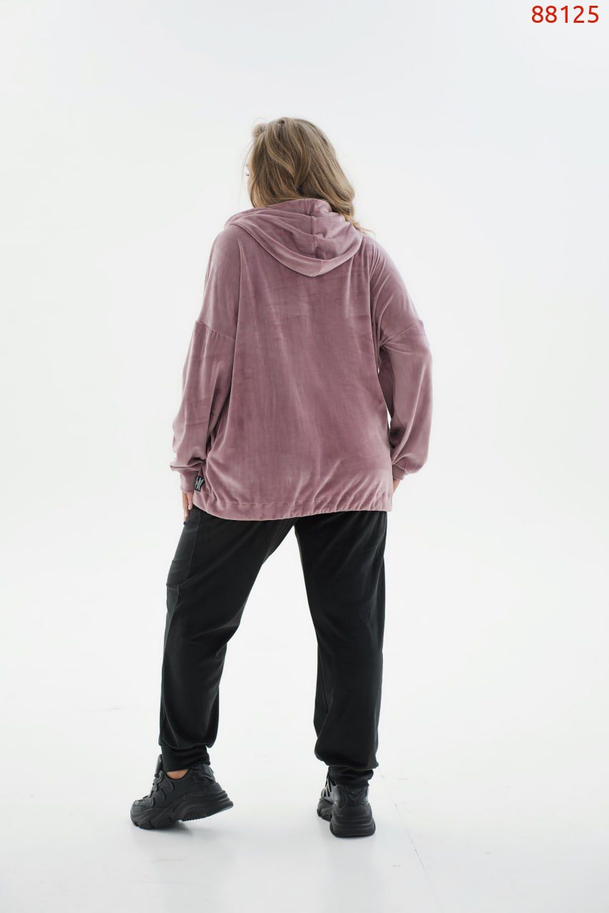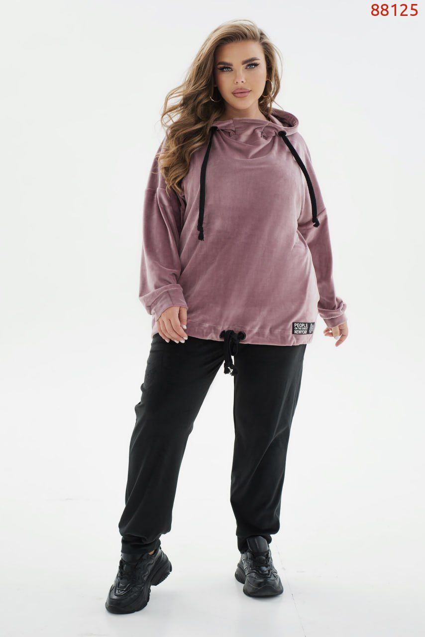 Яскравий спортивний костюм, що виконаний з м'якого велюру, стане улюбленою річчю для жінки, яка цінує практичність і не забуває про модні тенденції. У комплект входять лаконічні штани-джогери на резинці з кишенями і манжетами, а також комфортне худі, доповнене довгими рукавами з приспущеною лінією плечей і капюшоном з шнурком і люверсами.