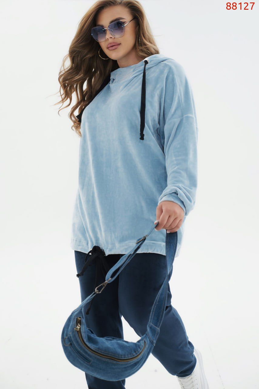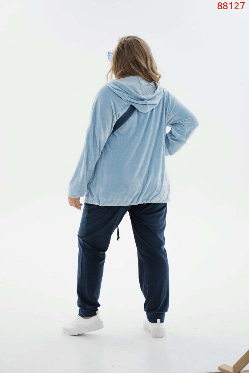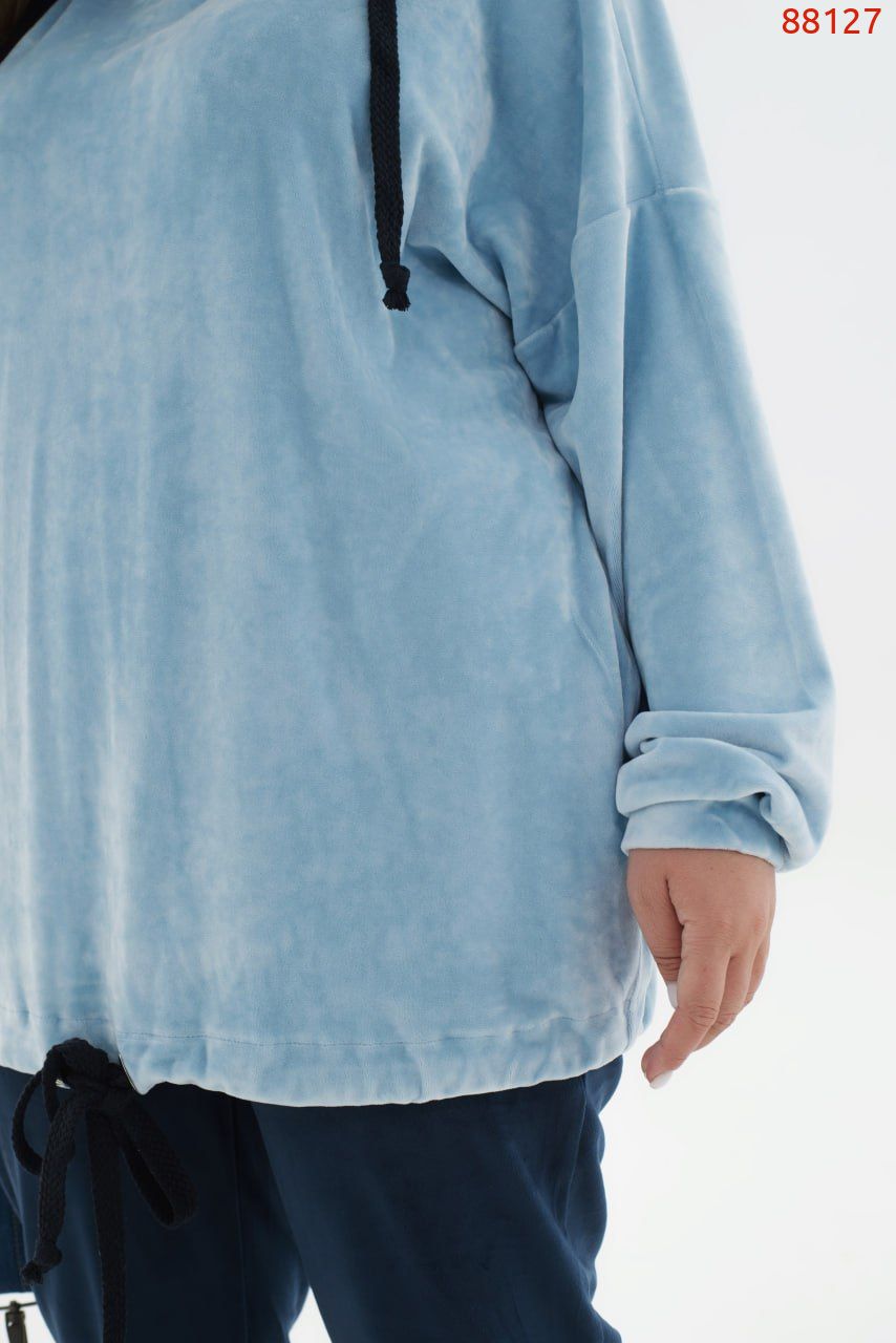Яскравий спортивний костюм, що виконаний з м'якого велюру, стане улюбленою річчю для жінки, яка цінує практичність і не забуває про модні тенденції. У комплект входять лаконічні штани-джогери на резинці з кишенями і манжетами, а також комфортне худі, доповнене довгими рукавами з приспущеною лінією плечей і капюшоном з шнурком і люверсами.