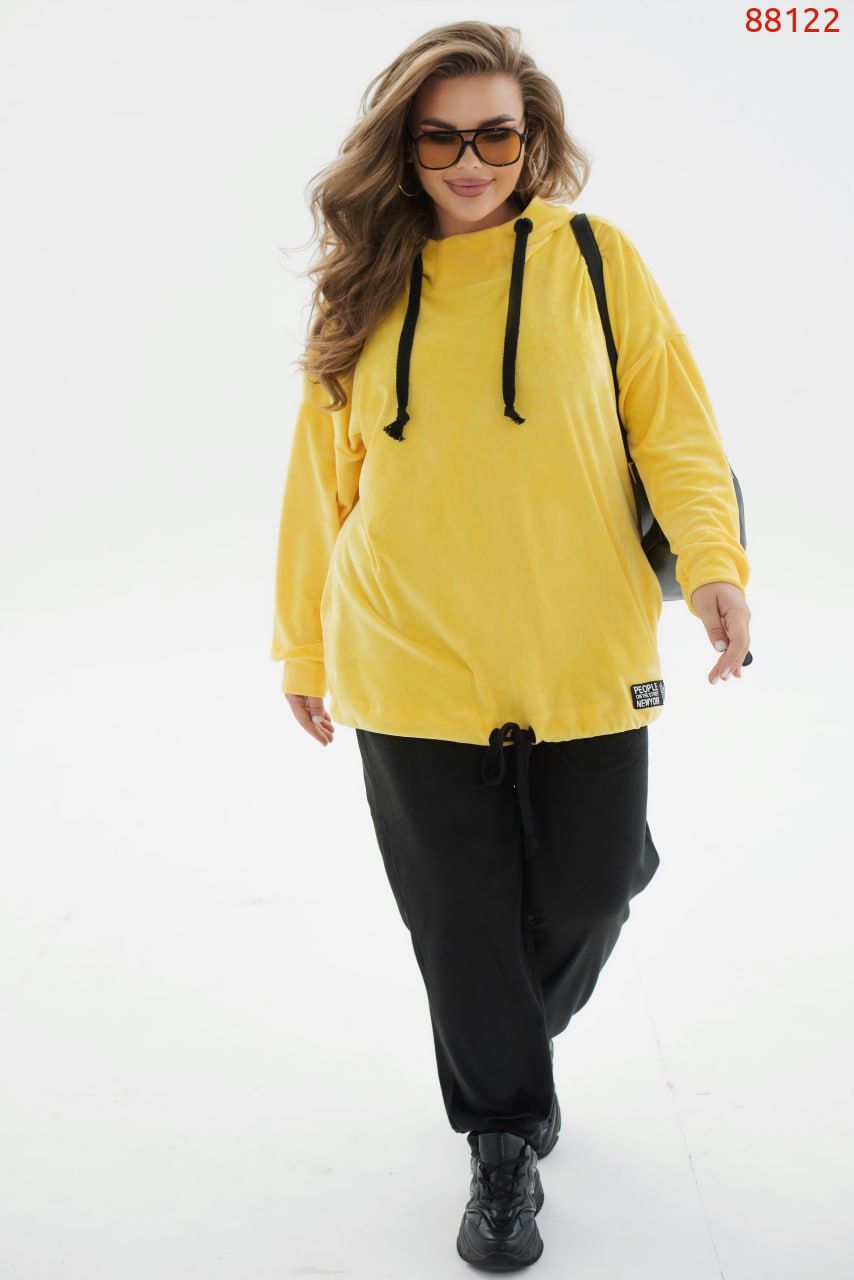 Яскравий спортивний костюм, що виконаний з м'якого велюру, стане улюбленою річчю для жінки, яка цінує практичність і не забуває про модні тенденції. У комплект входять лаконічні штани-джогери на резинці з кишенями і манжетами, а також комфортне худі, доповнене довгими рукавами з приспущеною лінією плечей і капюшоном з шнурком і люверсами.