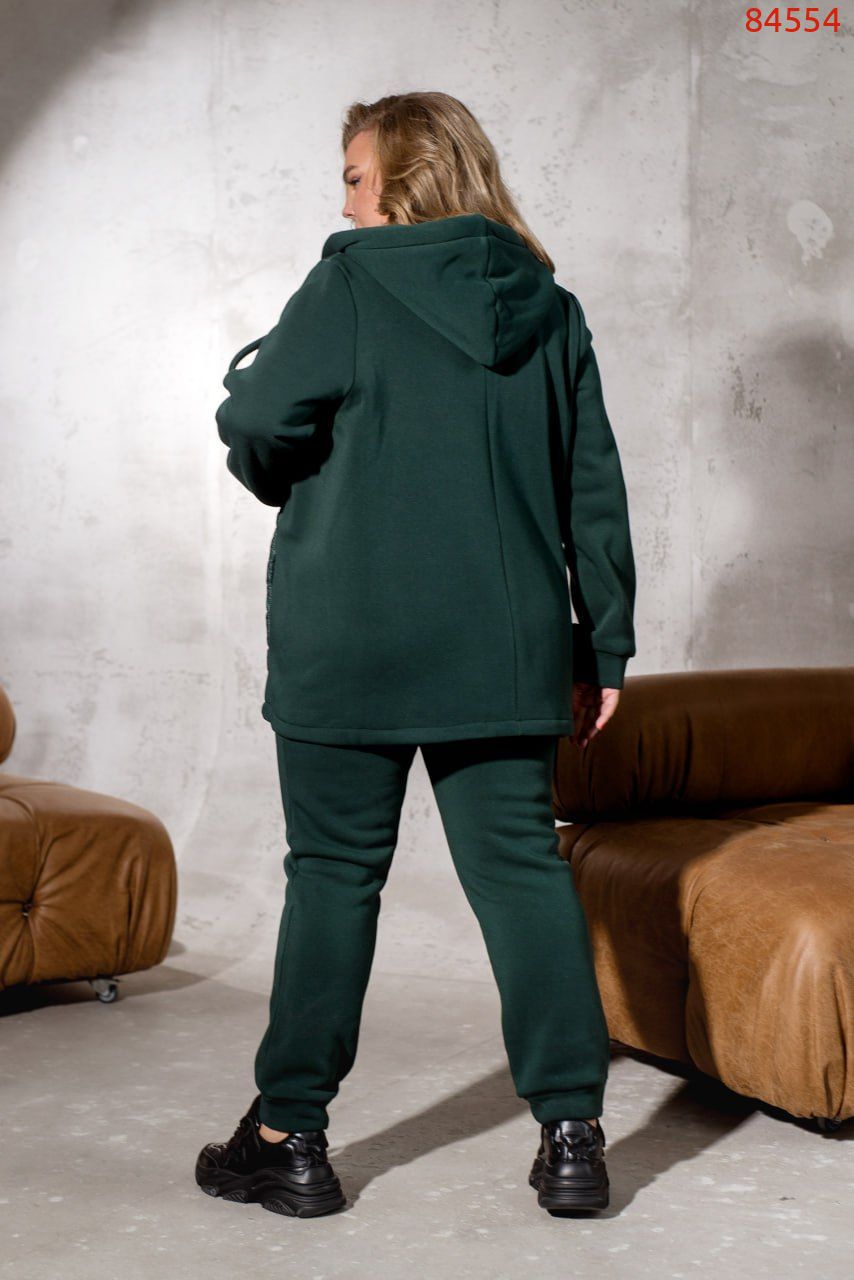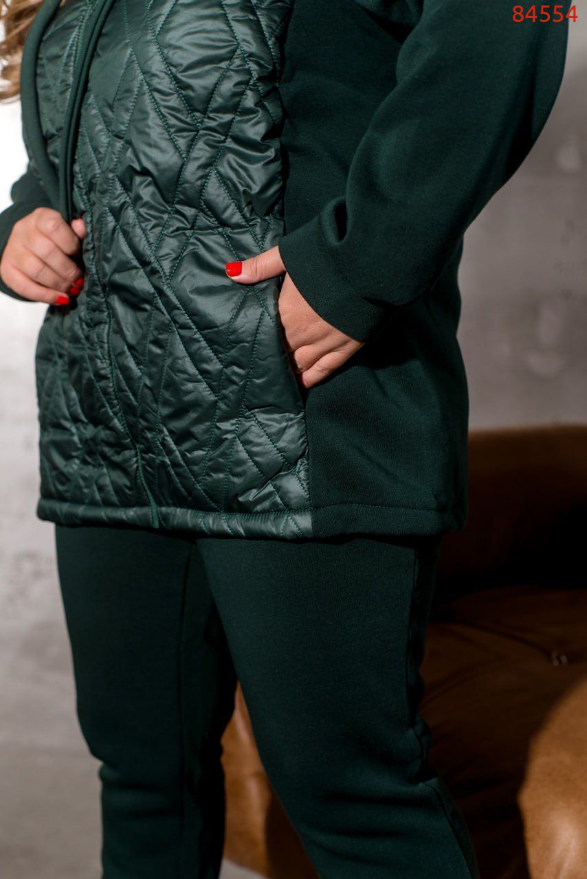 Універсальний костюм, який зігріє вас в прохолодну погоду, костюм складається із теплої кофти із трьохнитки на флісі, яка комбінована з плащівкою по передній частині виробу. Під плащівкою розміщена тонка підкладка. А по боках в основі ми додали кишені. Виріб, доповнений капюшоном зі шнурком та люверсами. Рукава довгі та доповнені манжетами. Брюки з гумкою на талії та бічними кишенями. Внизу штани на манжетах. Універсальний варіант для примхливої осінньої погоди для того, щоб бути завжди в теплі.