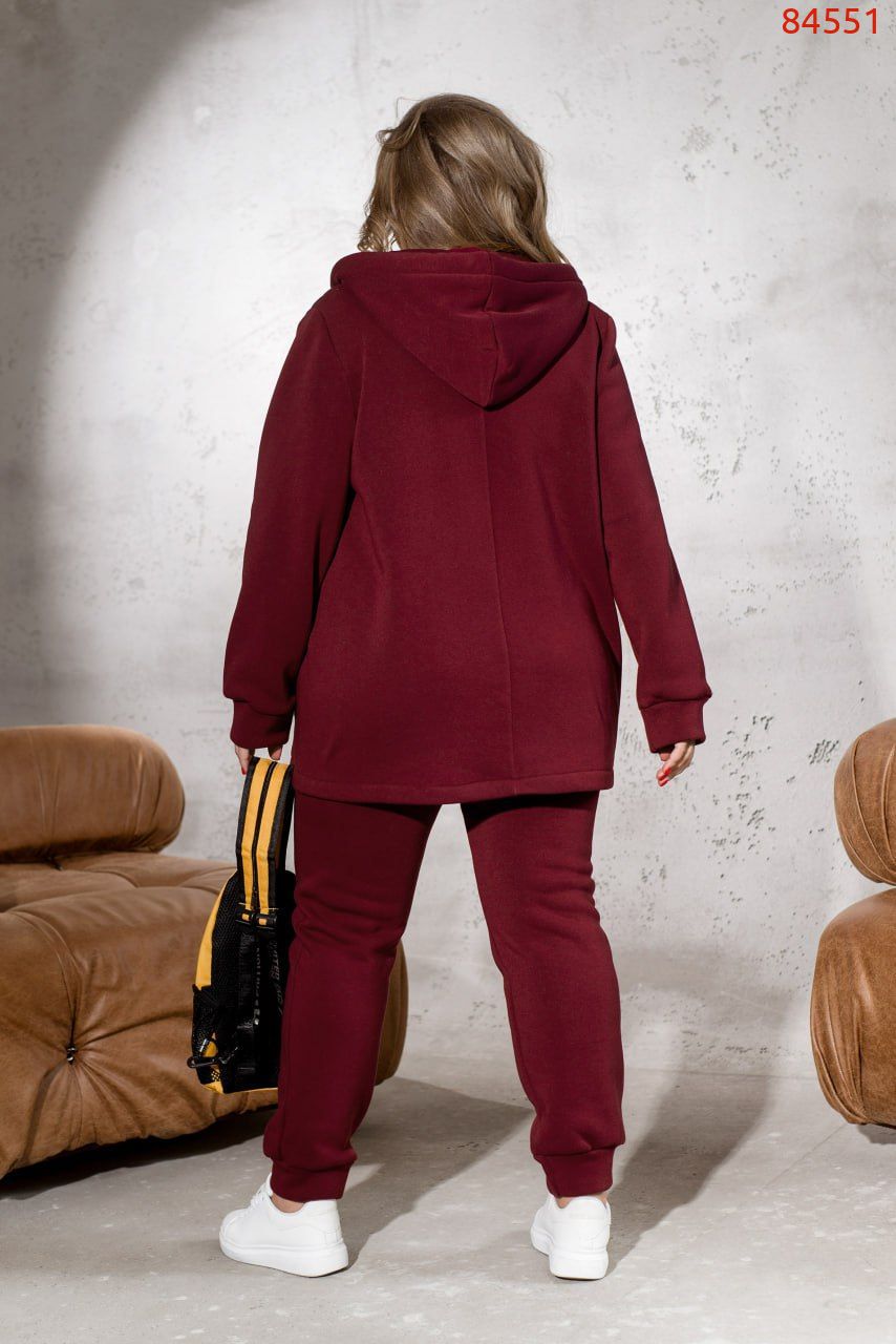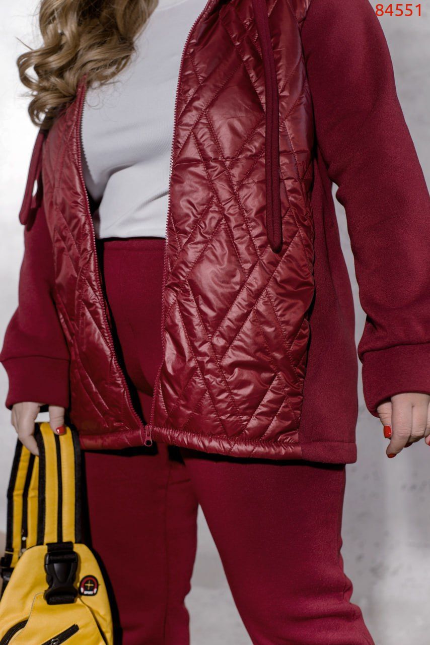 Універсальний костюм, який зігріє вас в прохолодну погоду, костюм складається із теплої кофти із трьохнитки на флісі, яка комбінована з плащівкою по передній частині виробу. Під плащівкою розміщена тонка підкладка. А по боках в основі ми додали кишені. Виріб, доповнений капюшоном зі шнурком та люверсами. Рукава довгі та доповнені манжетами. Брюки з гумкою на талії та бічними кишенями. Внизу штани на манжетах. Універсальний варіант для примхливої осінньої погоди для того, щоб бути завжди в теплі.