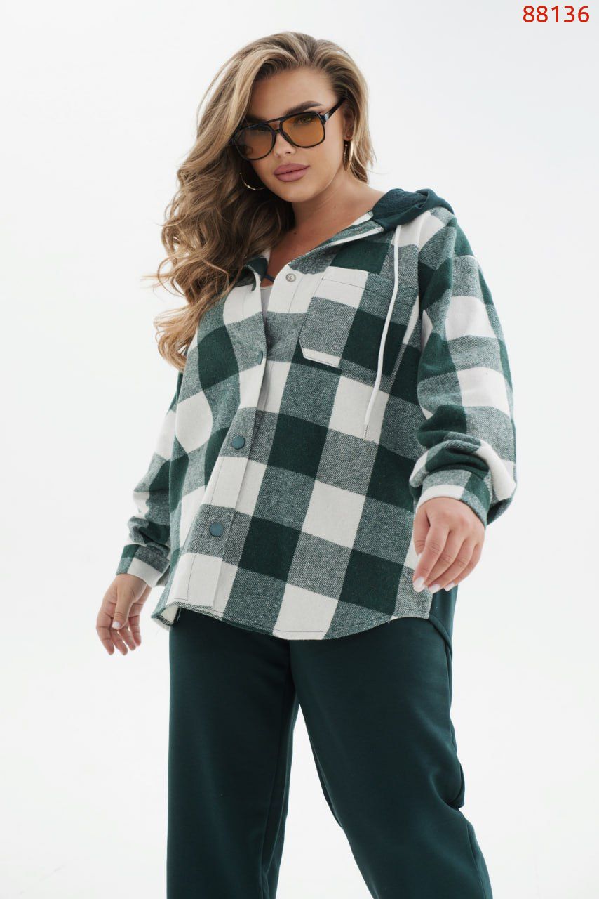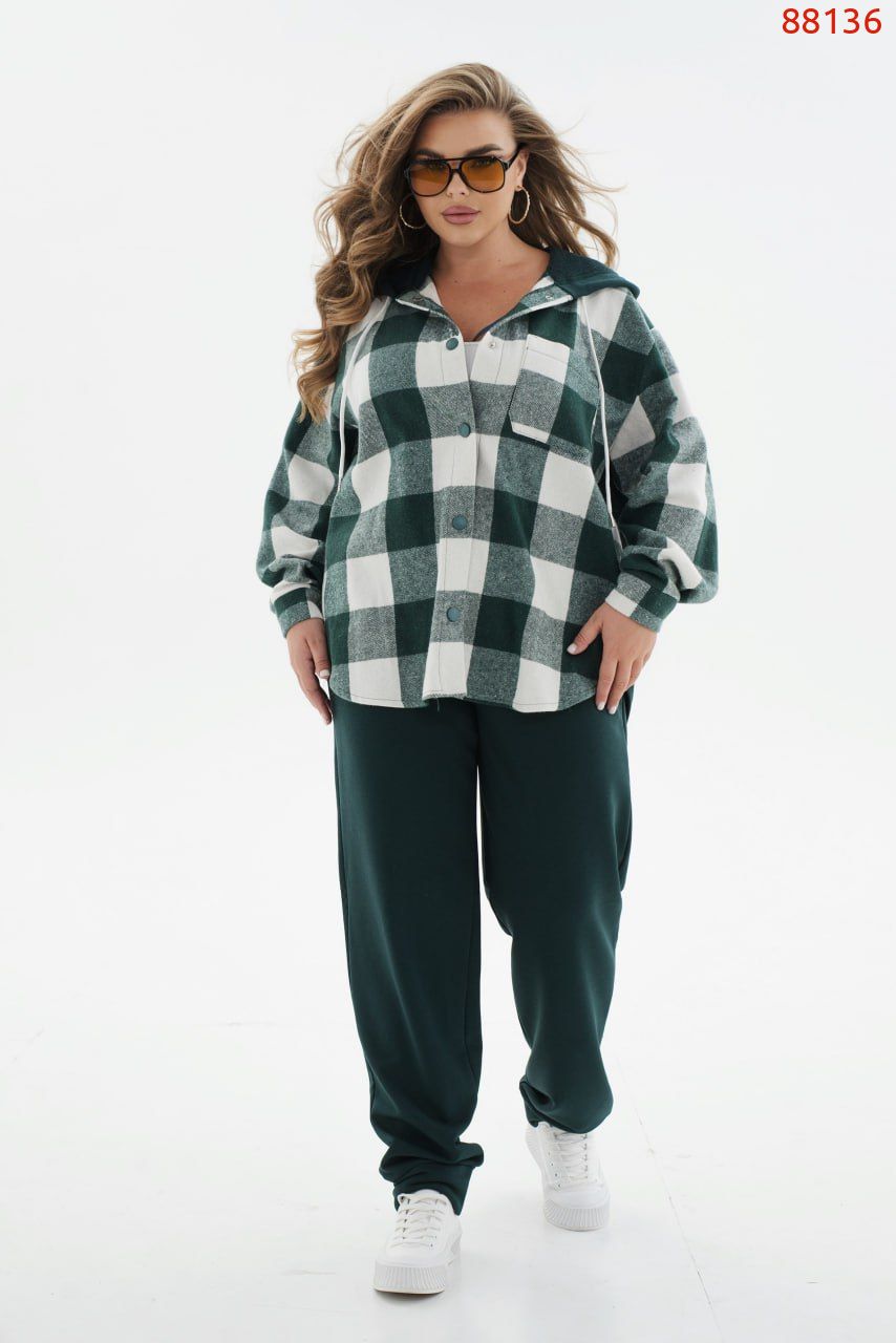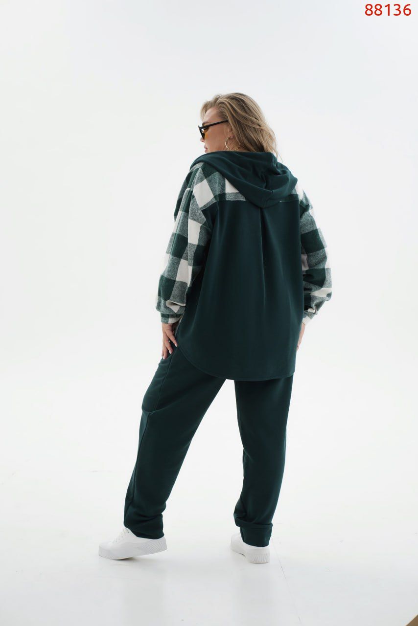 Ох, цей костюм з преміальної тканини підкорив наше серденько. Стильний, сучасний, а ще неймовірно зручний костюм, який складається з кофти – сорочки на кнопках та капюшона в тон штанів зі шнурком та класичних штанів в спортивному стилі з гумкою на талії та бічними кишенями. Рубашка із накладною кишенькою на грудях та довгими рукавами на манжеті. Поділ заокруглено, а на спинці є вставка з турецької трьохнитки петля без утеплення. Ця модель, виконана з тканини високої якості, яка не скатується при правильних умовах прання та ідеально тримає форму, а це означає, що цей костюм може стати вашим улюбленим не один сезон.