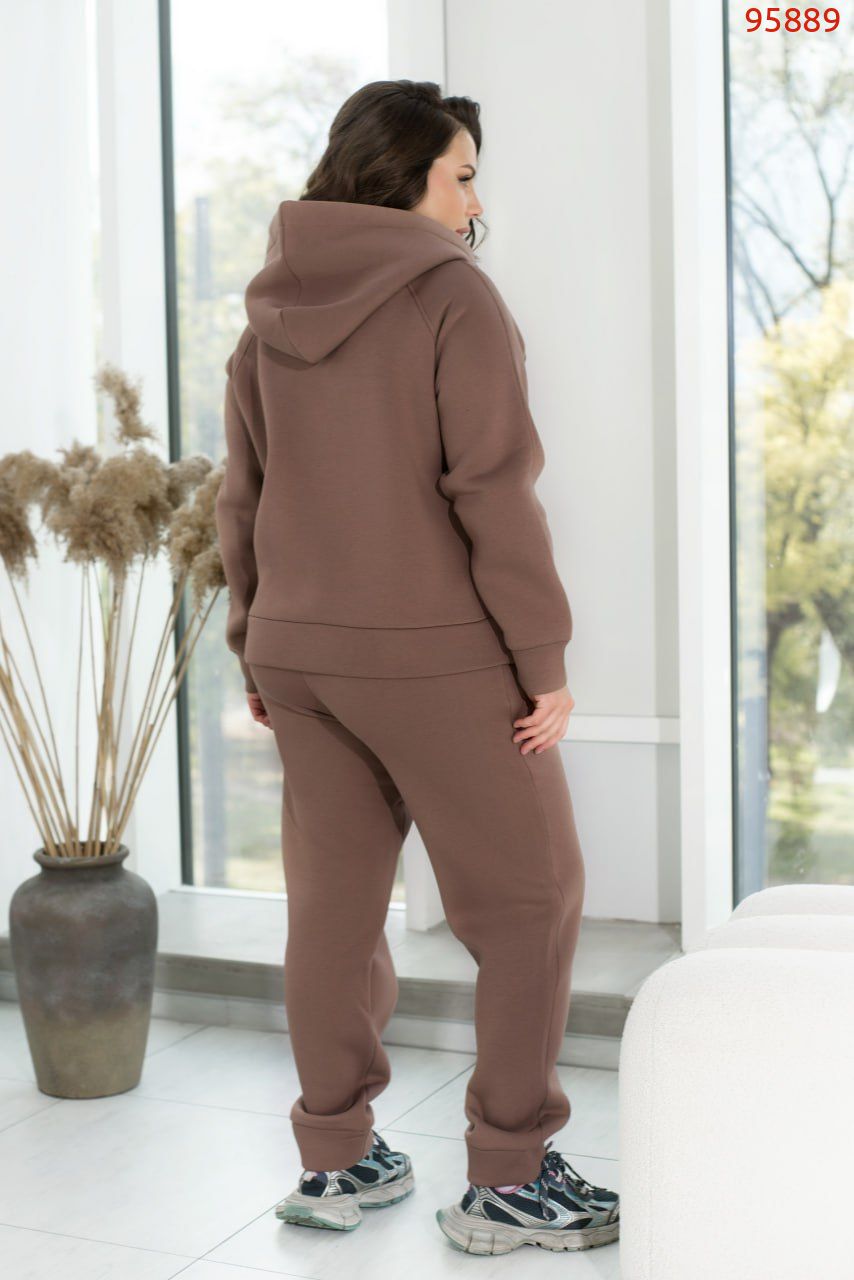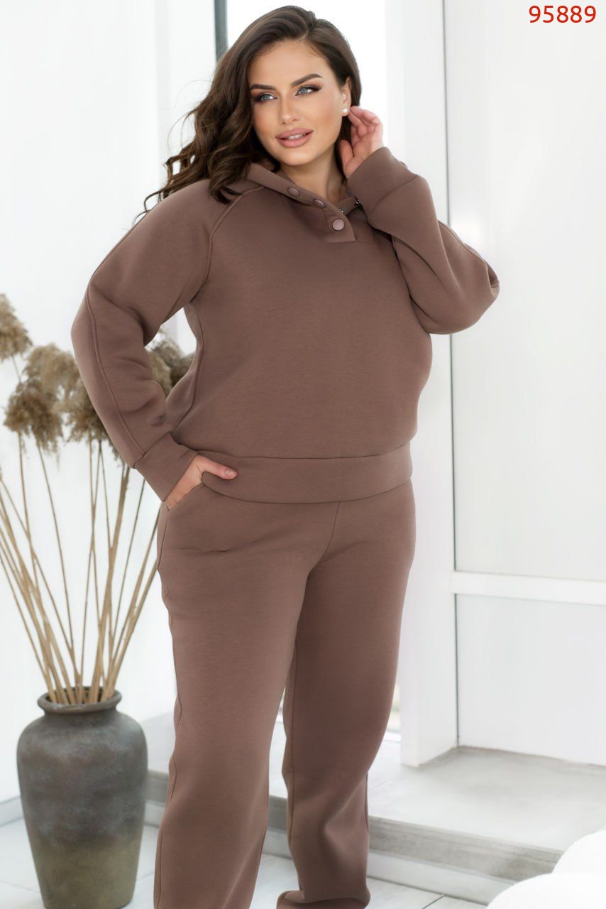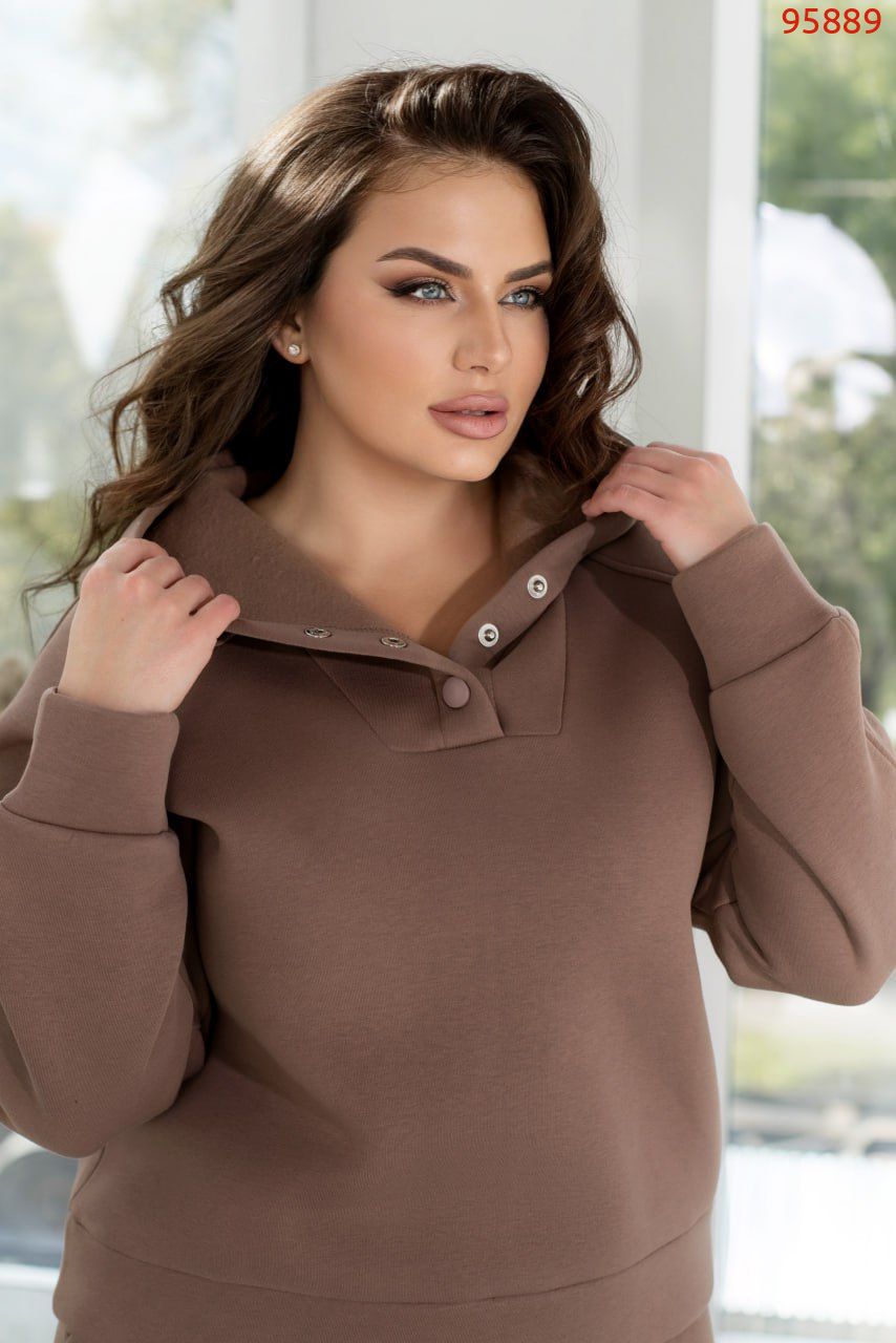 Теплий спортивний костюм із трьохнитки на флісі, який не кошлатиться, створений для максимального комфорту та затишку. Худі із капюшоном має дві кнопки на горловині, що надійно захищають від холоду та забезпечують додаткове тепло, прикриваючи шию. Довгі рукави з манжетами гарантують комфортну посадку та зберігають тепло. Штани з високою посадкою на гумці чудово підкреслюють талію, а манжети внизу забезпечують зручність та стиль. Модель також оснащена практичними боковими кишенями, які додають функціональності. Ідеальний варіант для прохолодної погоди та активного відпочинку.