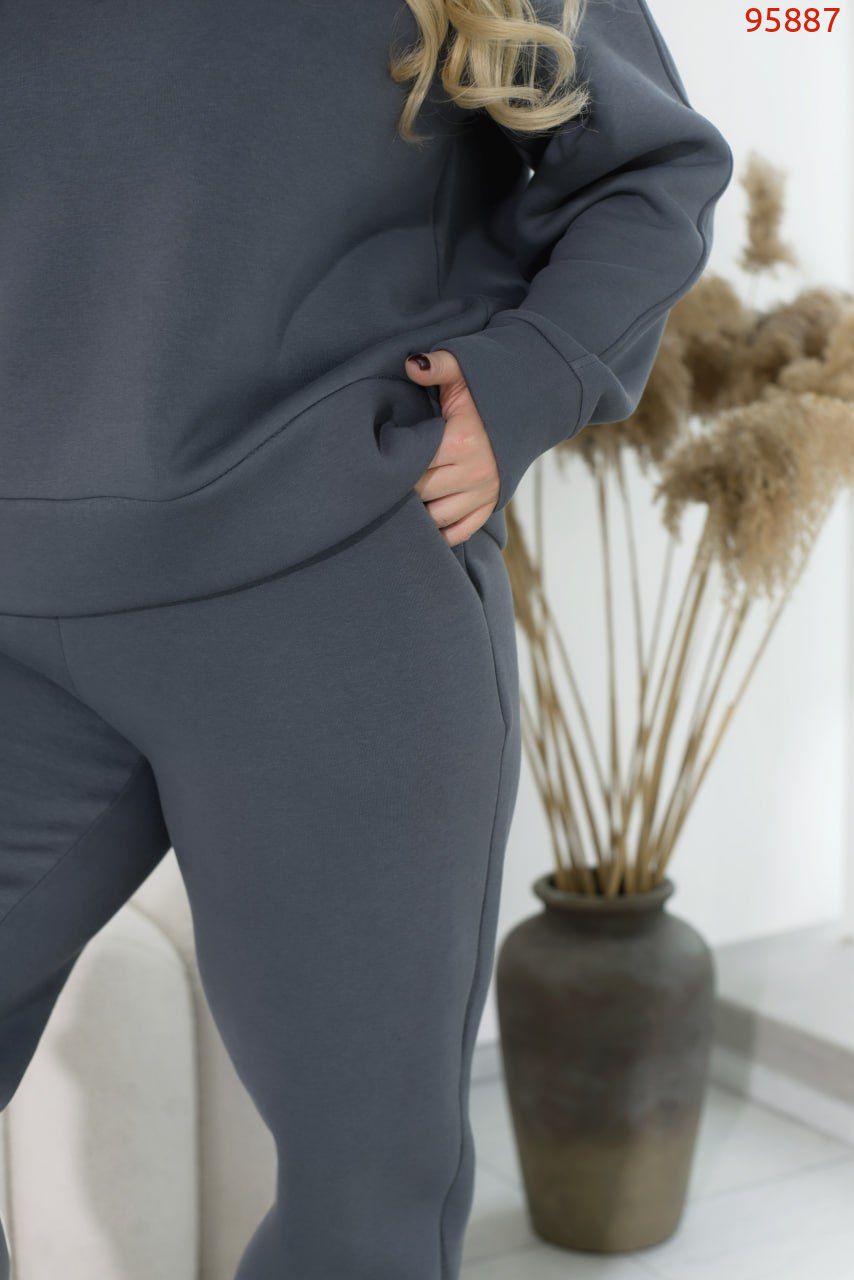 Теплий спортивний костюм із трьохнитки на флісі, який не кошлатиться, створений для максимального комфорту та затишку. Худі із капюшоном має дві кнопки на горловині, що надійно захищають від холоду та забезпечують додаткове тепло, прикриваючи шию. Довгі рукави з манжетами гарантують комфортну посадку та зберігають тепло. Штани з високою посадкою на гумці чудово підкреслюють талію, а манжети внизу забезпечують зручність та стиль. Модель також оснащена практичними боковими кишенями, які додають функціональності. Ідеальний варіант для прохолодної погоди та активного відпочинку.