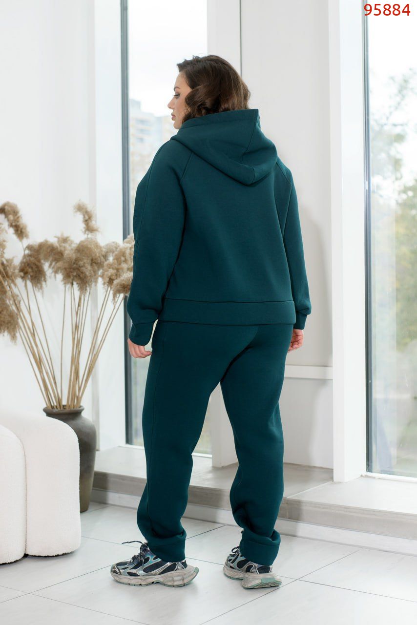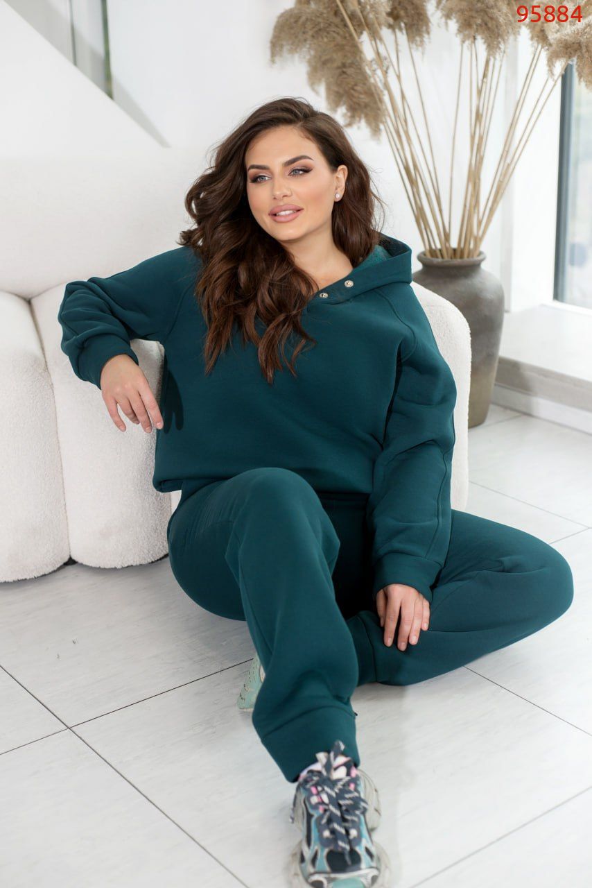 Теплий спортивний костюм із трьохнитки на флісі, який не кошлатиться, створений для максимального комфорту та затишку. Худі із капюшоном має дві кнопки на горловині, що надійно захищають від холоду та забезпечують додаткове тепло, прикриваючи шию. Довгі рукави з манжетами гарантують комфортну посадку та зберігають тепло. Штани з високою посадкою на гумці чудово підкреслюють талію, а манжети внизу забезпечують зручність та стиль. Модель також оснащена практичними боковими кишенями, які додають функціональності. Ідеальний варіант для прохолодної погоди та активного відпочинку.