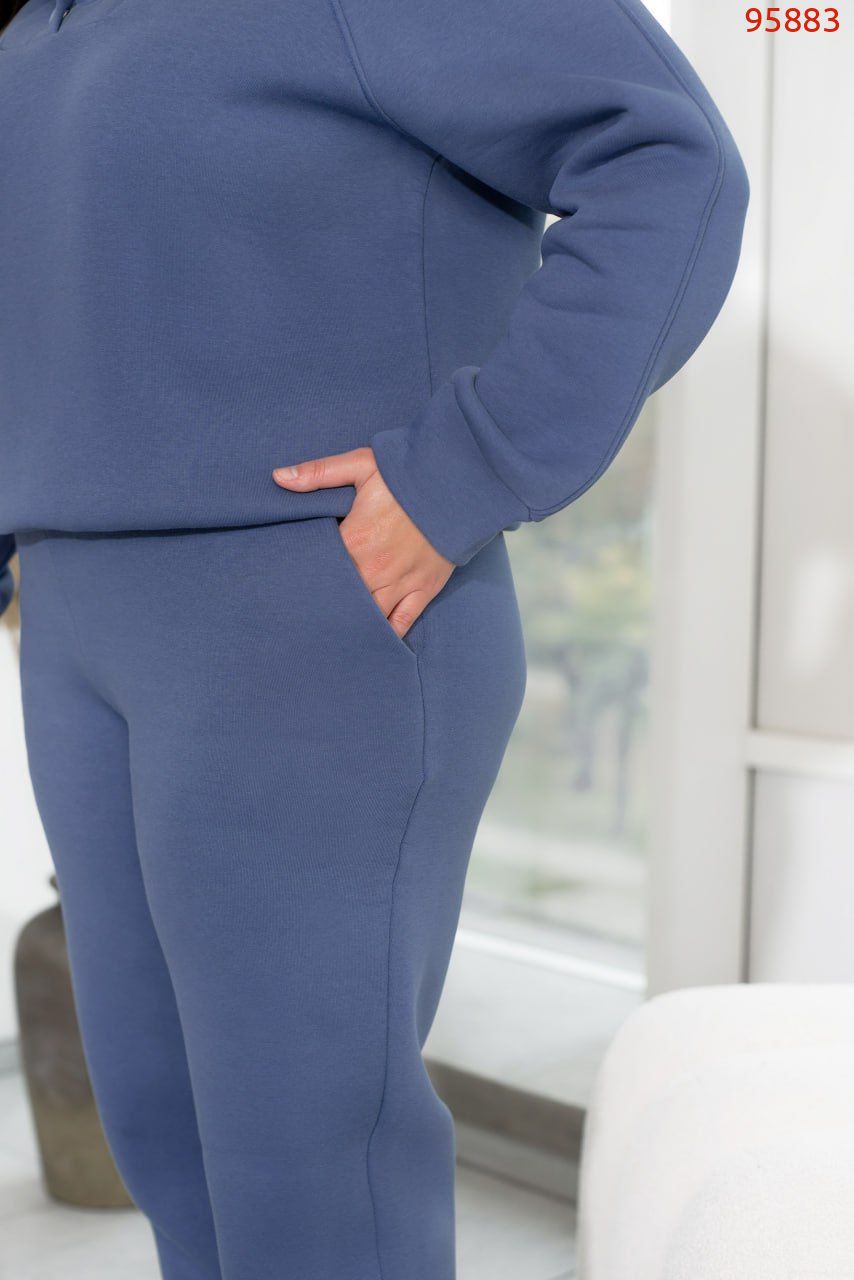 Теплий спортивний костюм із трьохнитки на флісі, який не кошлатиться, створений для максимального комфорту та затишку. Худі із капюшоном має дві кнопки на горловині, що надійно захищають від холоду та забезпечують додаткове тепло, прикриваючи шию. Довгі рукави з манжетами гарантують комфортну посадку та зберігають тепло. Штани з високою посадкою на гумці чудово підкреслюють талію, а манжети внизу забезпечують зручність та стиль. Модель також оснащена практичними боковими кишенями, які додають функціональності. Ідеальний варіант для прохолодної погоди та активного відпочинку.