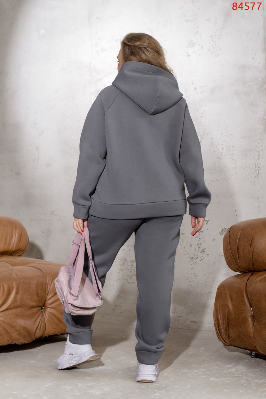 Теплий спортивний костюм із трьохнитки на флісі, який не кошлатиться, створений для максимального комфорту та затишку. Худі із капюшоном має дві кнопки на горловині, що надійно захищають від холоду та забезпечують додаткове тепло, прикриваючи шию. Довгі рукави з манжетами гарантують комфортну посадку та зберігають тепло. Штани з високою посадкою на гумці чудово підкреслюють талію, а манжети внизу забезпечують зручність та стиль. Модель також оснащена практичними боковими кишенями, які додають функціональності. Ідеальний варіант для прохолодної погоди та активного відпочинку.