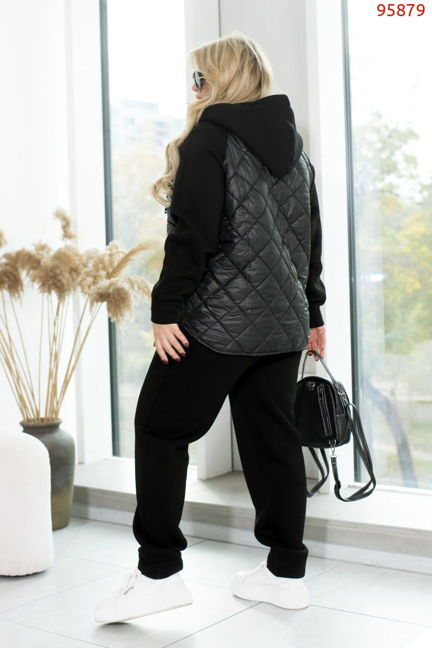 Спортивний костюм із кофтою на змійці, пошитий із поєднання тканин "стежка" та трьохнитки, створений для комфорту та стилю. Кофта оснащена капюшоном зі шнурком, що проходить через люверси, забезпечуючи захист і регулювання. Спереду розташовані врізні кишені для зручності. Рукава з трьохнитки з манжетами забезпечують комфортну посадку. Штани з високою посадкою на еластичній гумці з боковими кишенями і манжетами внизу додають функціональності та забезпечують тепло. Ідеальний вибір для активного відпочинку чи повсякденних занять.