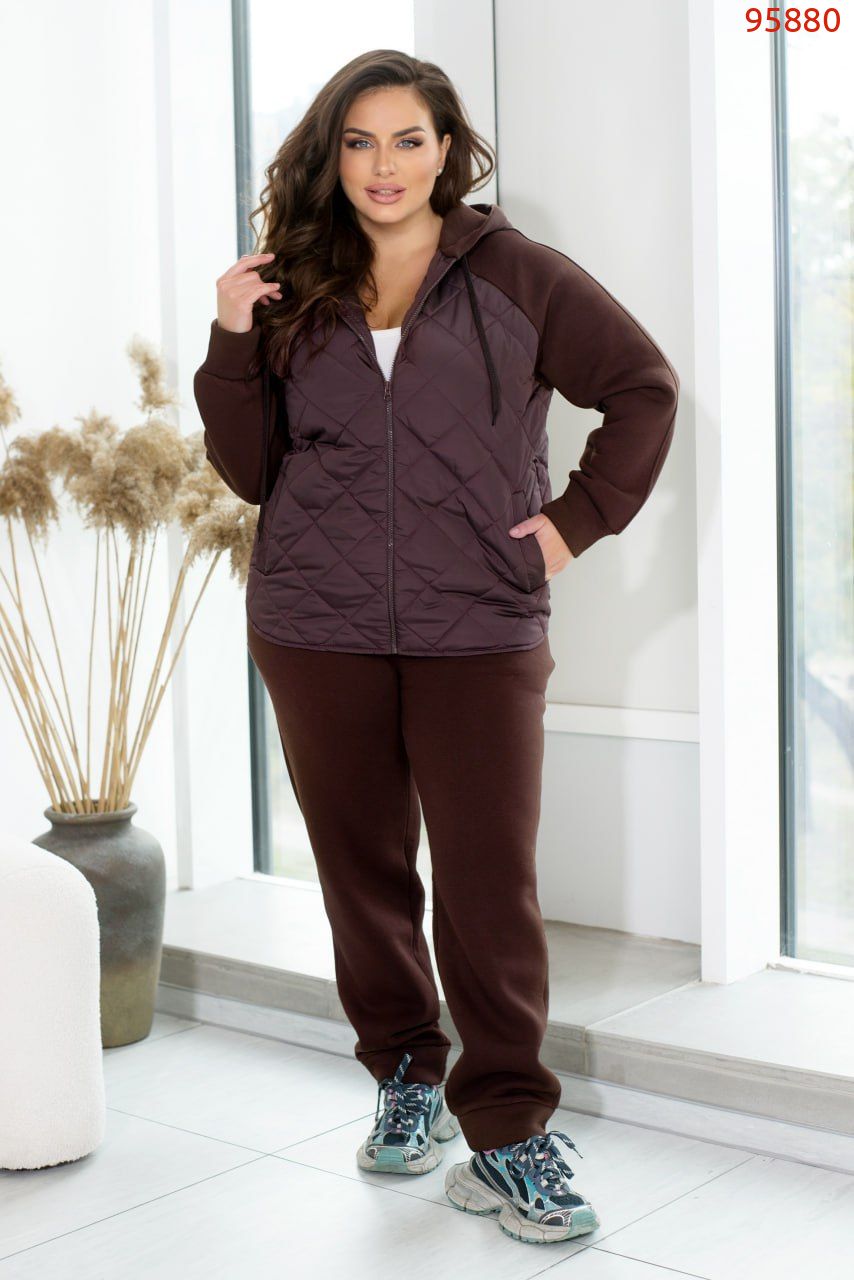 Спортивний костюм із кофтою на змійці, пошитий із поєднання тканин "стежка" та трьохнитки, створений для комфорту та стилю. Кофта оснащена капюшоном зі шнурком, що проходить через люверси, забезпечуючи захист і регулювання. Спереду розташовані врізні кишені для зручності. Рукава з трьохнитки з манжетами забезпечують комфортну посадку. Штани з високою посадкою на еластичній гумці з боковими кишенями і манжетами внизу додають функціональності та забезпечують тепло. Ідеальний вибір для активного відпочинку чи повсякденних занять.