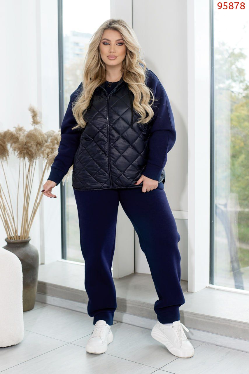 Спортивний костюм із кофтою на змійці, пошитий із поєднання тканин "стежка" та трьохнитки, створений для комфорту та стилю. Кофта оснащена капюшоном зі шнурком, що проходить через люверси, забезпечуючи захист і регулювання. Спереду розташовані врізні кишені для зручності. Рукава з трьохнитки з манжетами забезпечують комфортну посадку. Штани з високою посадкою на еластичній гумці з боковими кишенями і манжетами внизу додають функціональності та забезпечують тепло. Ідеальний вибір для активного відпочинку чи повсякденних занять.