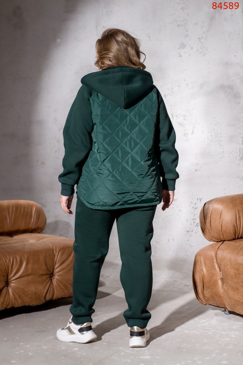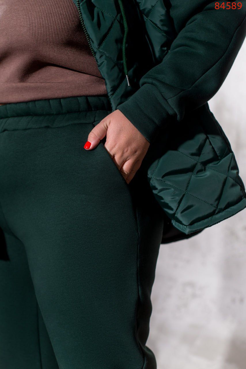 Спортивний костюм із кофтою на змійці, пошитий із поєднання тканин "стежка" та трьохнитки, створений для комфорту та стилю. Кофта оснащена капюшоном зі шнурком, що проходить через люверси, забезпечуючи захист і регулювання. Спереду розташовані врізні кишені для зручності. Рукава з трьохнитки з манжетами забезпечують комфортну посадку. Штани з високою посадкою на еластичній гумці з боковими кишенями і манжетами внизу додають функціональності та забезпечують тепло. Ідеальний вибір для активного відпочинку чи повсякденних занять.