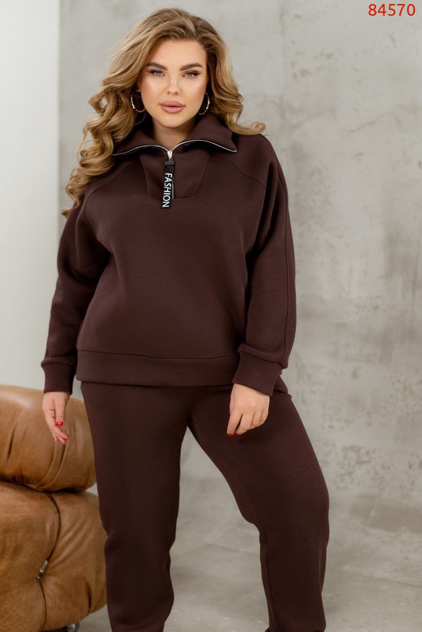Спортивний костюм із трьохнитки на флісі забезпечує ідеальне поєднання тепла та комфорту в прохолодну погоду. Худі має зручну змійку і високу горловину, що ефективно захищає шию від холоду. Довгі рукави з манжетами забезпечують комфортну посадку та зберігають тепло. Штани з високою посадкою на еластичній гумці підкреслюють фігуру та забезпечують максимальну свободу рухів. Манжети внизу штанів додають стильного вигляду та додаткового тепла. Бокові кишені роблять костюм практичним і зручним для щоденного носіння або активного відпочинку.