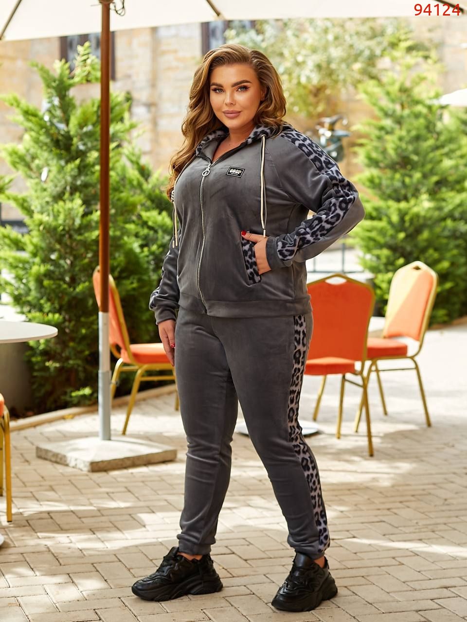 Кофта вільного силуету з капюшоном , кишені листочки. Прикрашений вставками з леопарда. Рукав на манжеті.