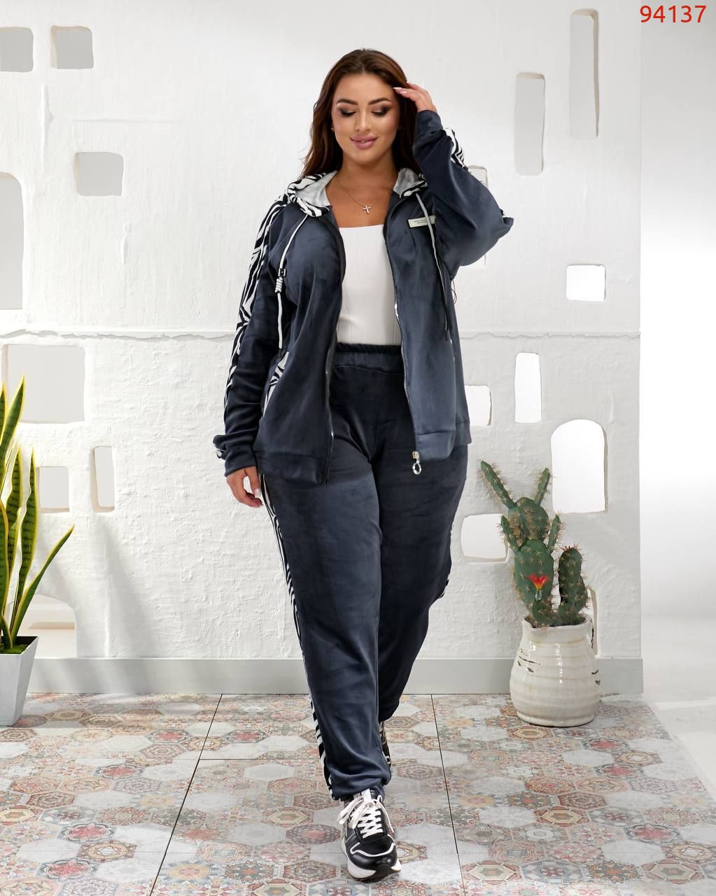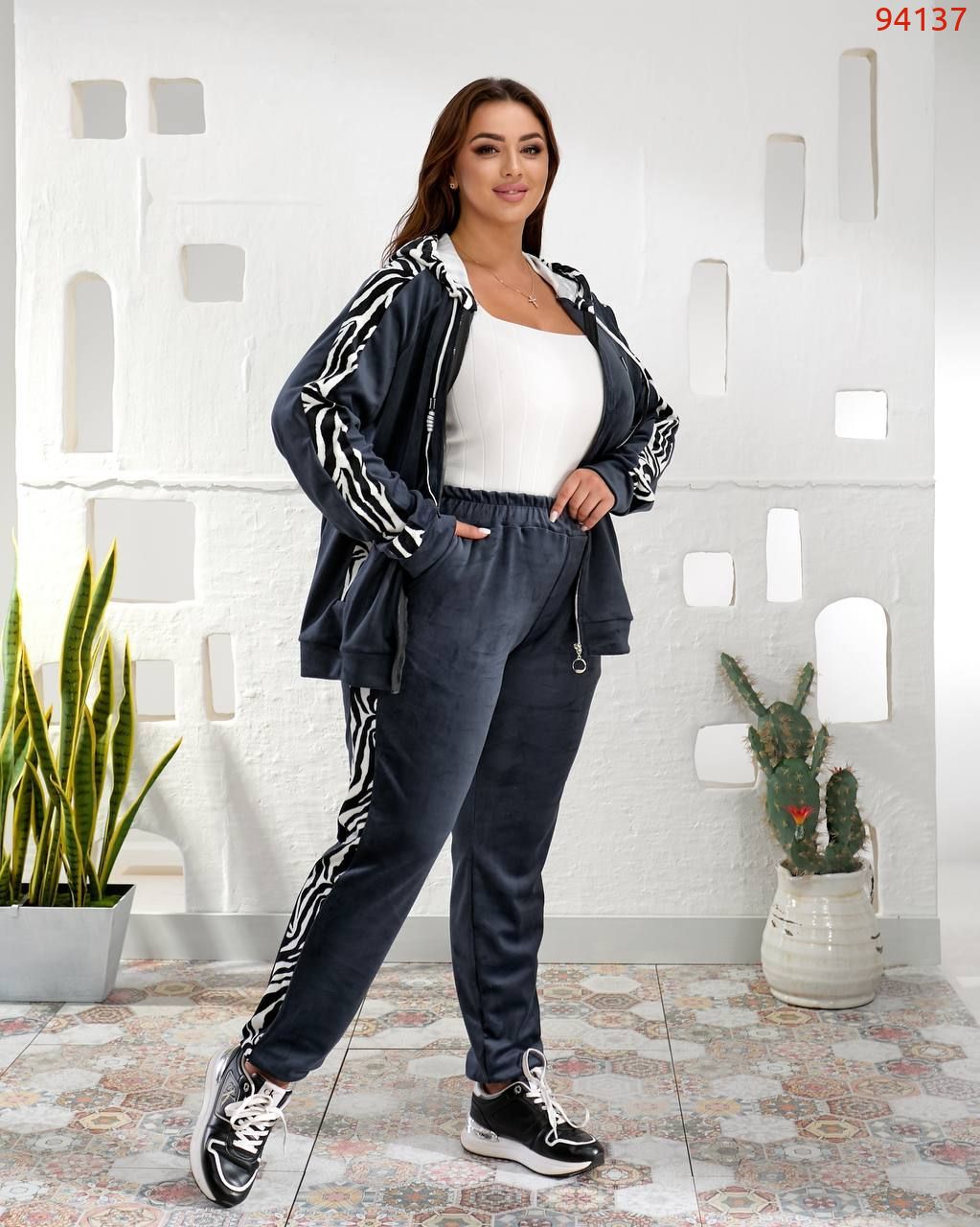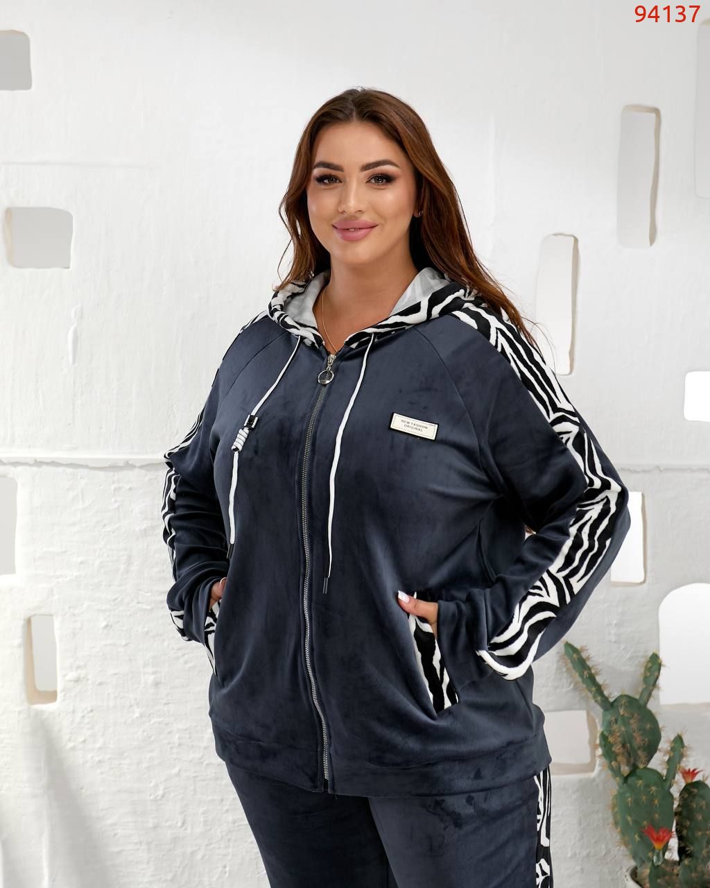 Кофта вільного силуету з капюшоном , кишені листочки. Прикрашений вставками з зебри. Рукав на манжеті.