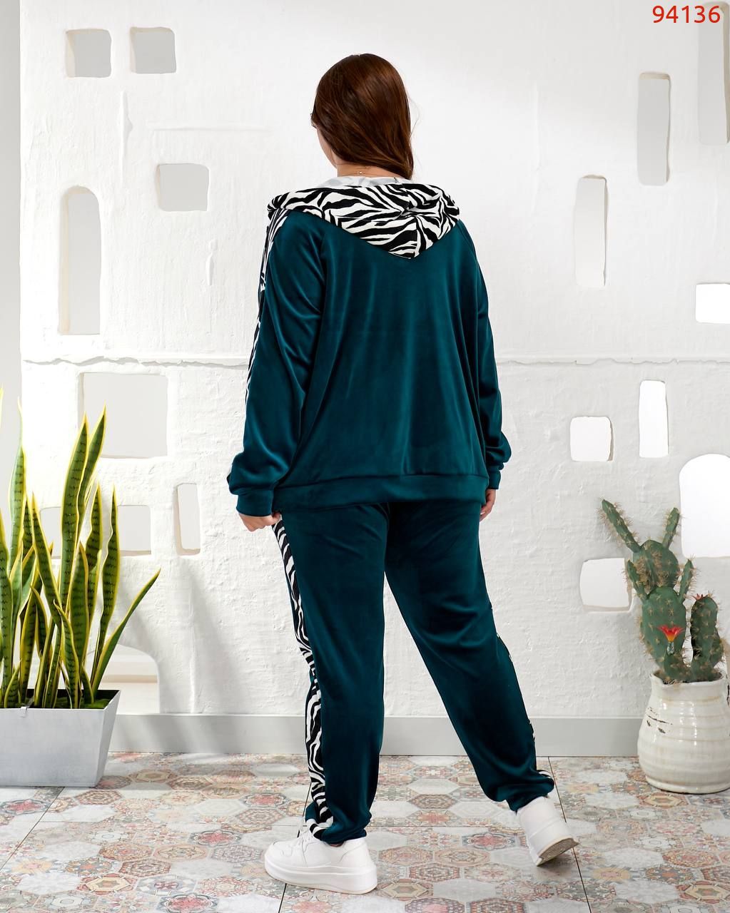 Кофта вільного силуету з капюшоном , кишені листочки. Прикрашений вставками з зебри. Рукав на манжеті.