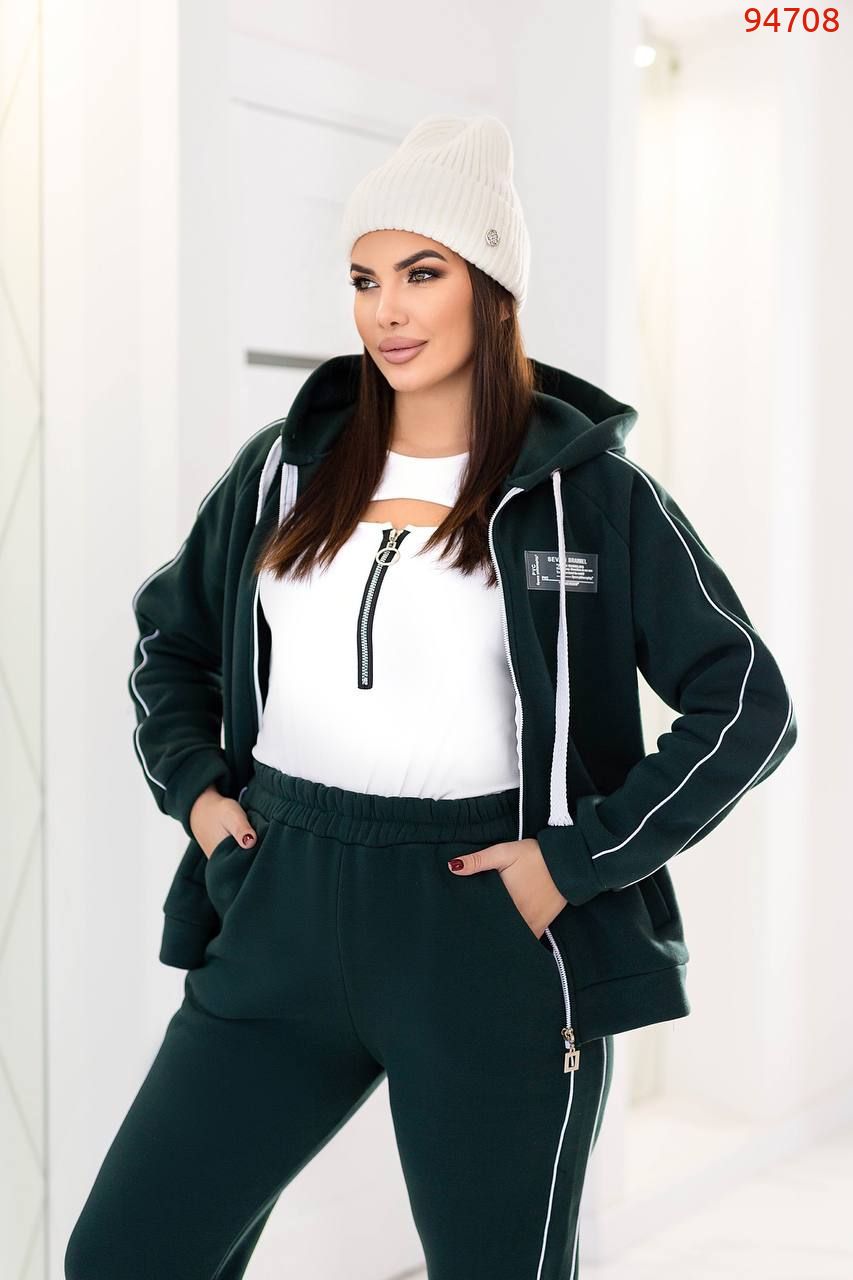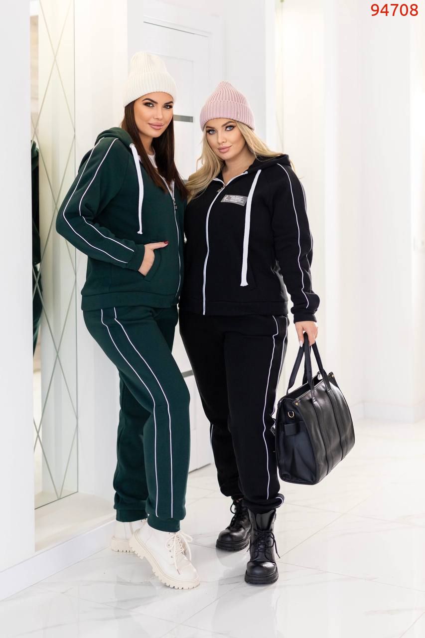 Штани висока посадка, вільного крою прикрашені стрічками , що візуально витягую ніжку.Мають еластичний пояс що забезпечує відмінну посадку та комфорт при русі. У штанах є кишені в бокових швах . На штанах стильні лампаси які, гарно поєднуються .Спортивний костюм доступний у різних кольорах та розмірах, що дозволяє вибрати відповідний варіант для кожного клієнта. У цьому костюмі ви будете себе відчувати комфортно, підійде для прогулянок, заняття спортом або просто для відпочинку.