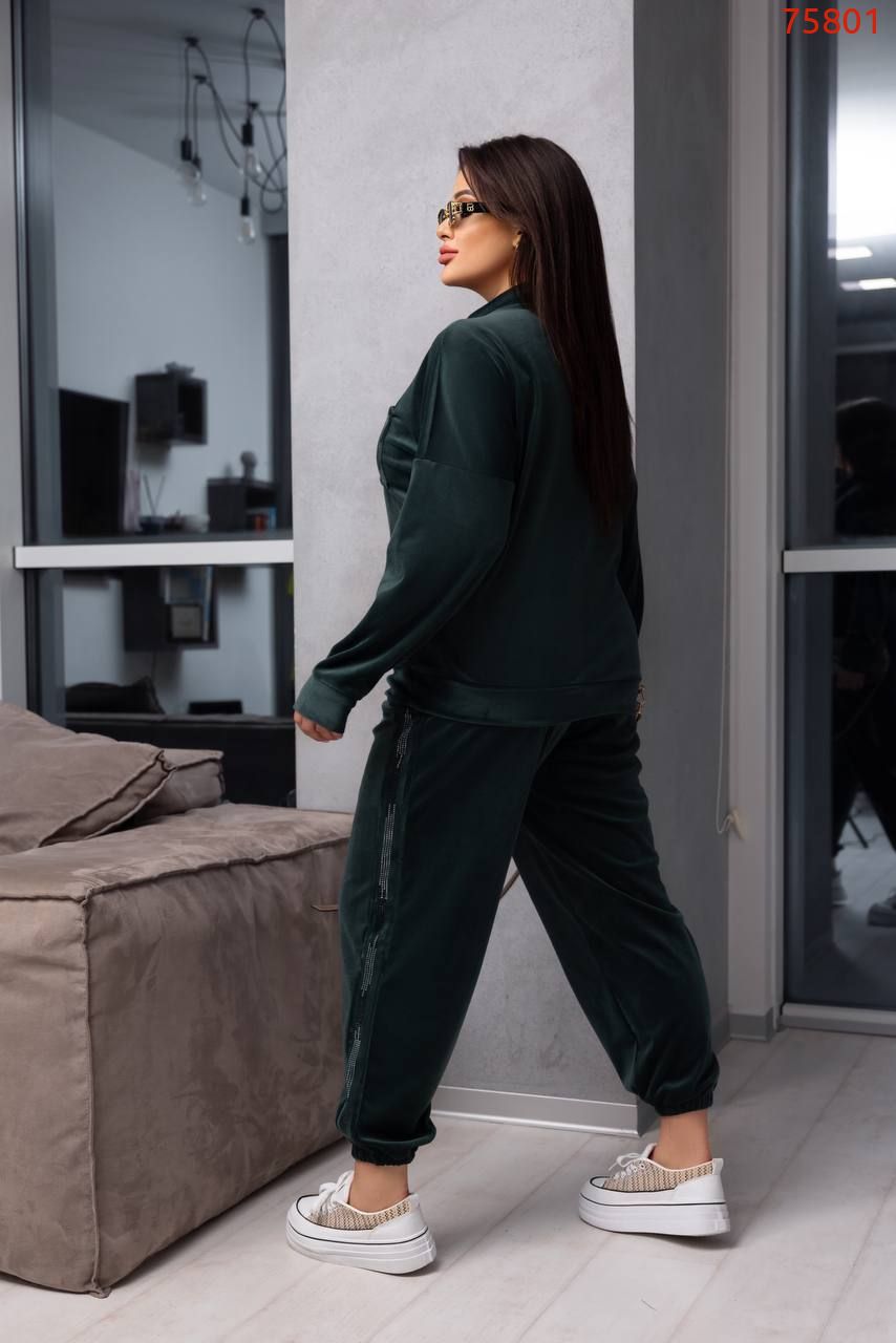 Велюровий прогулянковий костюм складається зі штанів, низ та пояс на резинці, високої посадки з двома кишенями, оздоблені лампасами зі стразами. Кишеня кофтинки - світшоту оздоблена стразами.