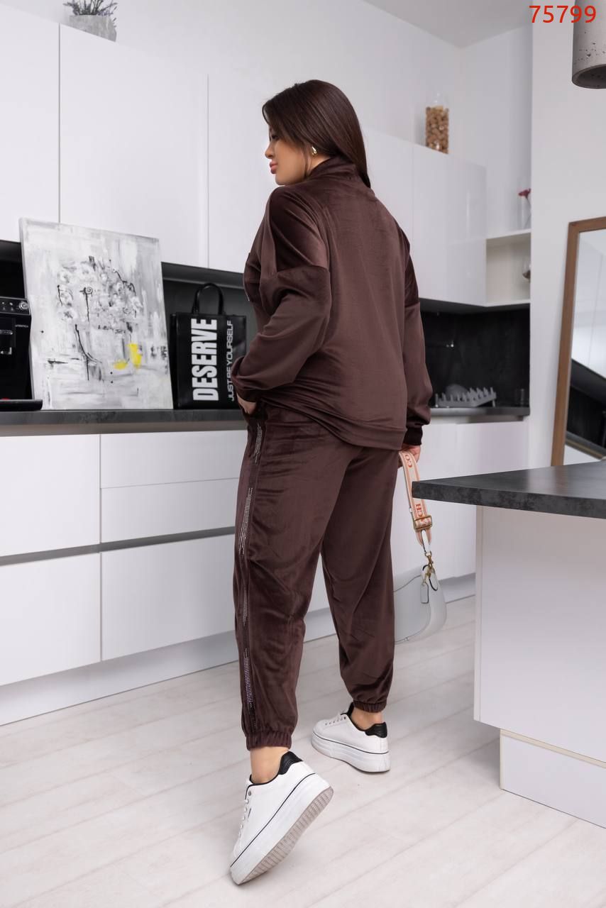 Велюровий прогулянковий костюм складається зі штанів, низ та пояс на резинці, високої посадки з двома кишенями, оздоблені лампасами зі стразами. Кишеня кофтинки - світшоту оздоблена стразами.