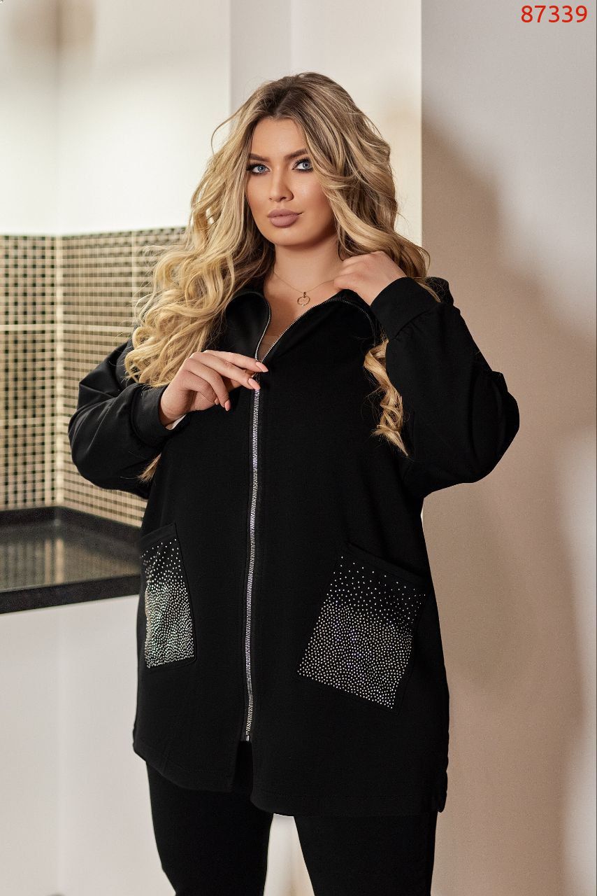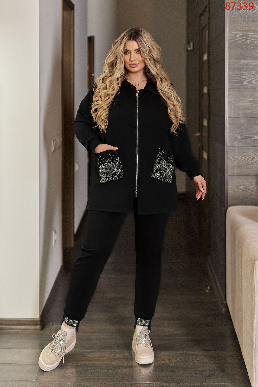 Прекрасний костюм, кофтинка вільного крою з кишенями прикрашені стразами, Штани на резінці, з кишенями на манжеті теж стрази Посадка штанів висока. ,пояс прошитий на поясній машинці, зручний, прикольний костюм.