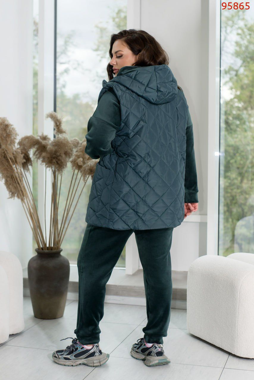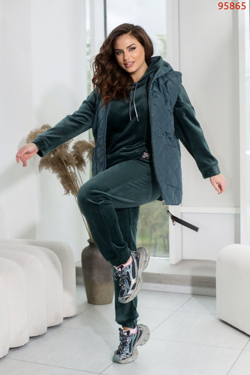 Зустрічайте наш універсальний костюм трійка, створений для стильних і зручних образів у прохолодну погоду. Комплект складається з жилетки з капюшоном та накладними кишенями, кофти зі спущеними рукавами та капюшоном зі шнурком, а також прямих штанів з середньою посадкою і кишенями по боках.Жилетка додає практичності та стилю завдяки капюшону і накладним кишеням. Кофта з капюшоном і спущеними рукавами створює невимушений і затишний образ. Прямі штани з середньою посадкою забезпечують комфорт і стиль. Вони практичні завдяки кишеням по боках і низу на резинці. Цей костюм – вибір активних жінок, які цінують якість і стиль.Ідеальний варіант, для жінок, які поспішають та полюбляють бути в комфорті. Доповніть образ кросівками чи об'ємними чоботями