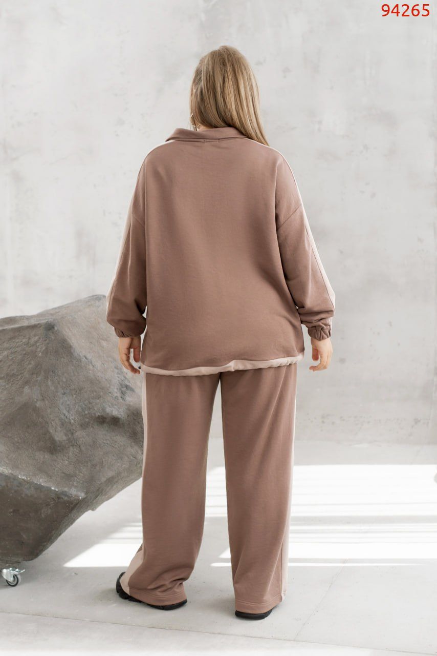 Твій повсякденний стиль і комфорт – це наш новий костюм.Кофта з акцентними вставками підкреслює модний образ, невеликий комір-стійка та блискавка додають зручності, а рукава зі заниженою лінією плеча і затяжки знизу дарують ідеальну посадку. Штани вільного крою з акцентними вставками, еластичною талією та бічними кишеньками завершують образ, роблячи його зручним для будь-якого дня. Тренд, свобода рухів і практичність – все в одному костюмі!