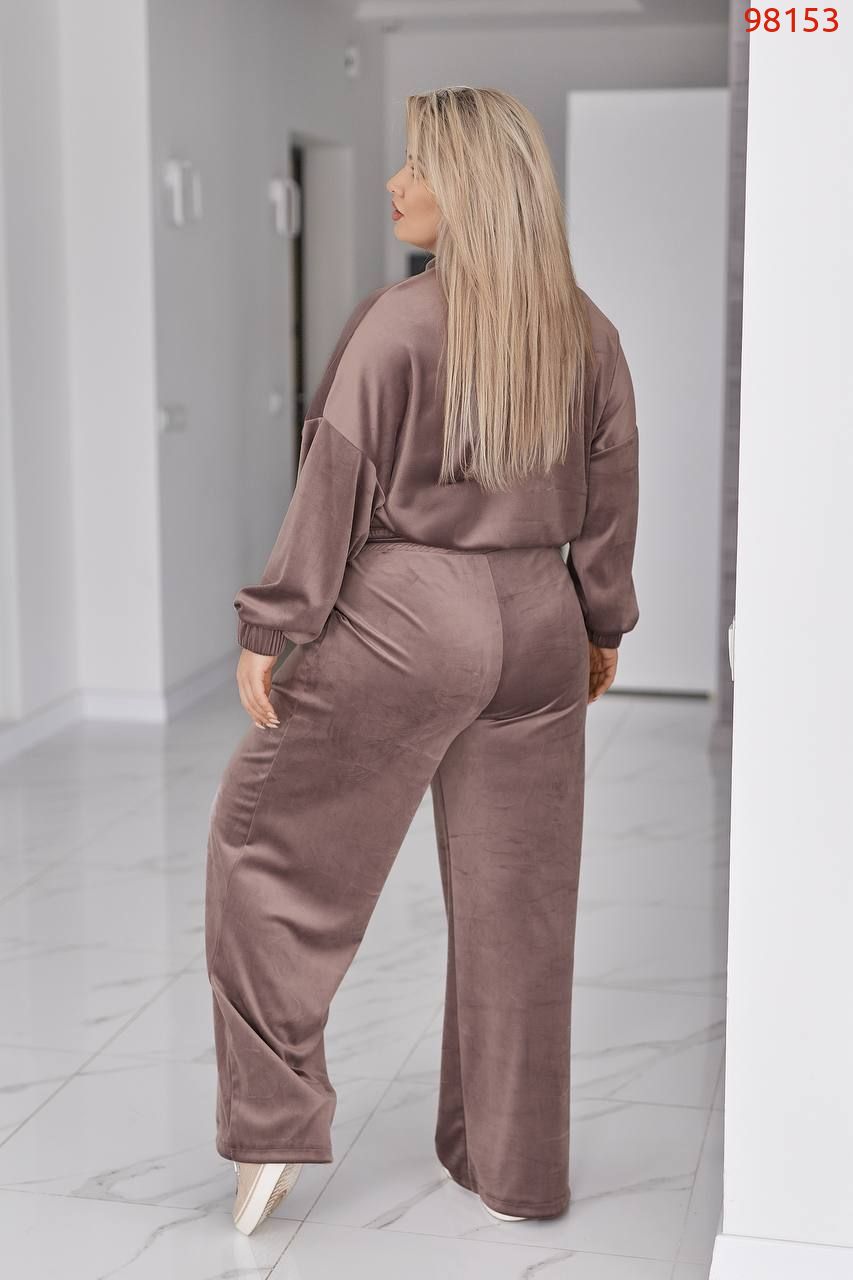Велюровий оксамитовий костюм складається з кофти і штанів. Кофта вільного крою oversize, з застібкою блискавкою і коміром стійкою. В рельєфних швах спереду є кишені. Рукав зі спущеною лінією плеча, манжети на рукавах та низ кофти на еластичній широкій резинці.