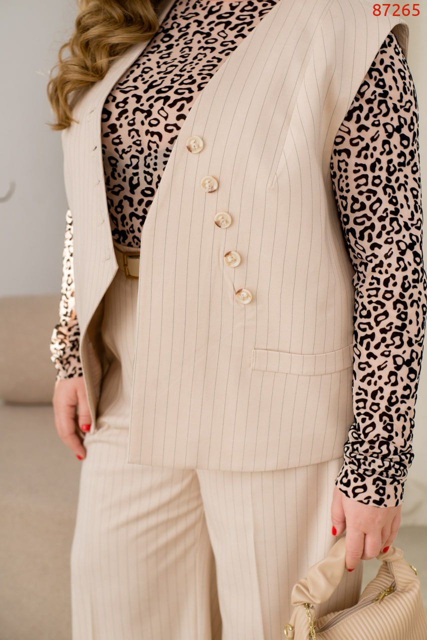 Ця стильна жилетка з тканини преміум якості у трендових кольорах – ідеальне поєднання класики та сучасного стилю. Її оригінальний косий крій одразу привертає увагу, а діагональне розташування ґудзиків додає витонченого акценту. Завдяки продуманому силуету жилетка ідеально підкреслює фігуру, надаючи образу елегантності та впевненості. Імітація кишень додає декоративного шарму, а якісна підкладка забезпечує комфорт протягом усього дня. Ця модель легко поєднується з блузами, сорочками чи навіть легкими светрами, створюючи стильні та гармонійні образи. Носіть її з класичними штанами або спідницями й будьте неперевершеними як на ділових зустрічах, так і на особливих подіях!