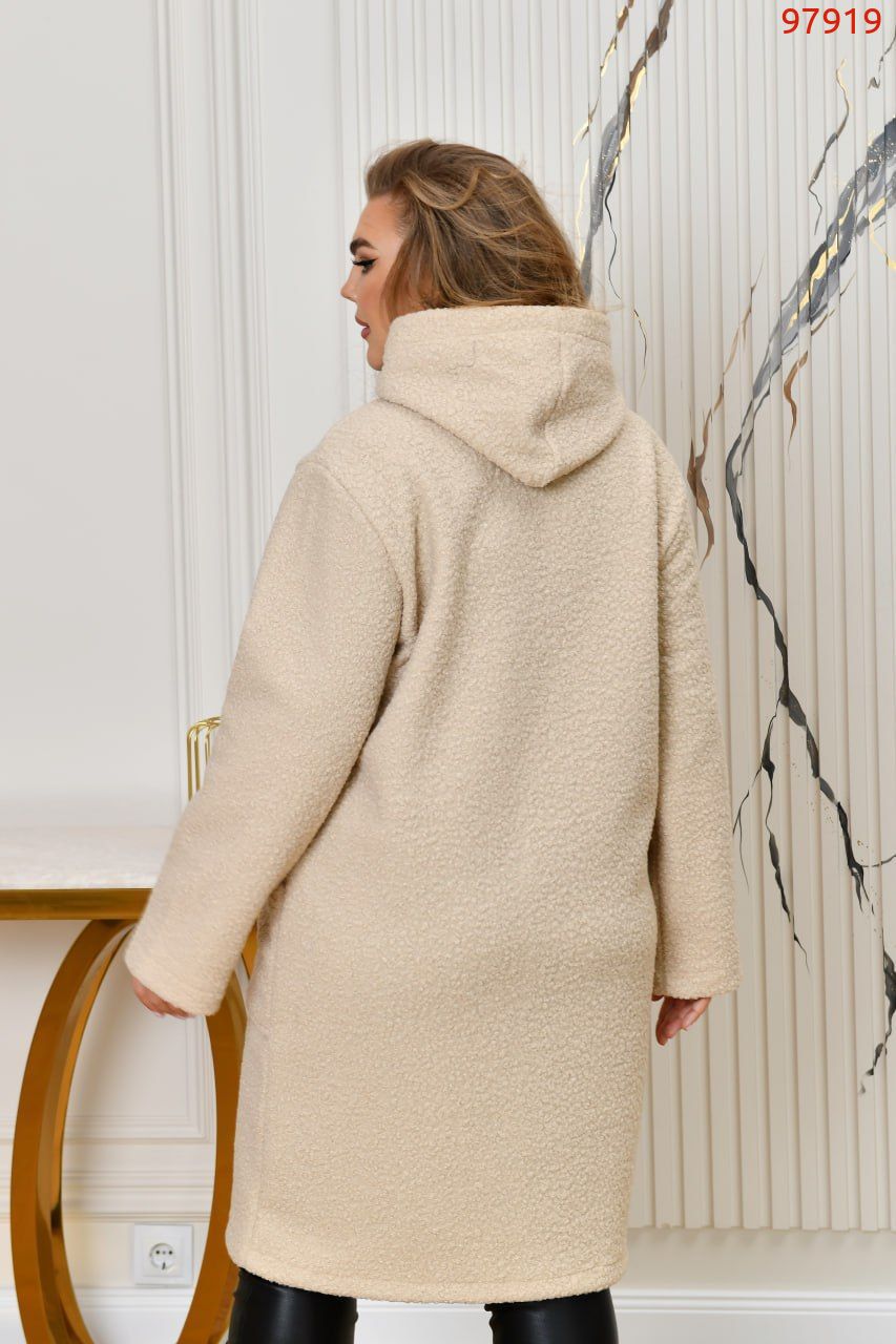 Неймовірно стильний кардиган з капюшоном, із буклє «баранець» ( розтяжність мінімальна). Силует прямий, вільний. Застібається на блискавку. Попереду оброблені дві накладні кишені. Кардиган декорований якісною нашивкою. Підкладу немає.