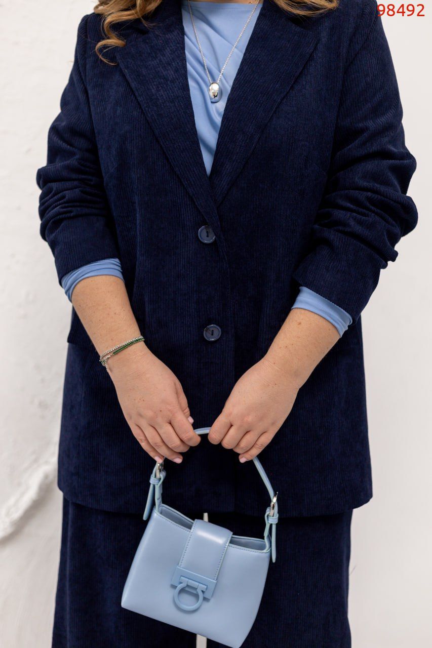 Цей стильний піджак із вельвету – поєднання класики та актуальної фактури. М’яка тканина з виразним рубчиком додає образу глибини й статусності, а продуманий крій забезпечує бездоганну посадку. Модель добре тримає форму завдяки ущільненню дублерином, що зміцнює деталі та допомагає виробу виглядати структуровано. Піджак має підкладку, підплічники та місткі кишені (кишені прошиті – перед використанням їх потрібно акуратно розпороти). Довгі рукави прямого крою, застібка на два ґудзики та вертикальні й горизонтальні виточки формують жіночний силует і красиво підкреслюють фігуру. Легко комбінується з брюками чи спідницею, створюючи як стримані ділові, так і більш розслаблені образи. Це той піджак, який додає впевненості та робить стиль завершеним у будь-якій ситуації. Пояс НЕ входить в комплект.