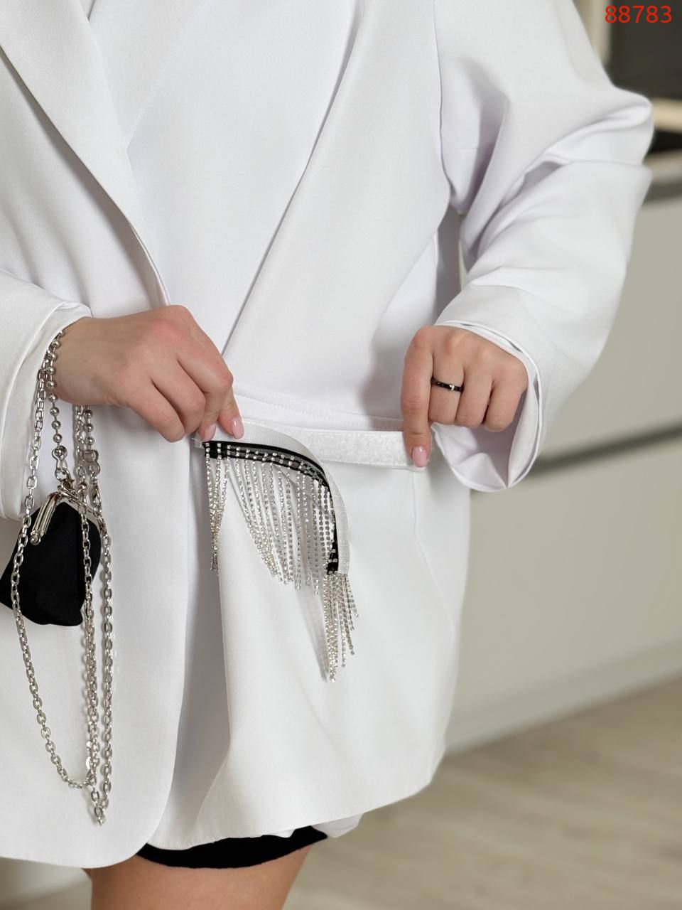 Піджак на підкладці, Декорований бахромою з каменів Сваровського, які пристосуються на ліпучці. З камінцями- нарядний варіант, без - офісний.