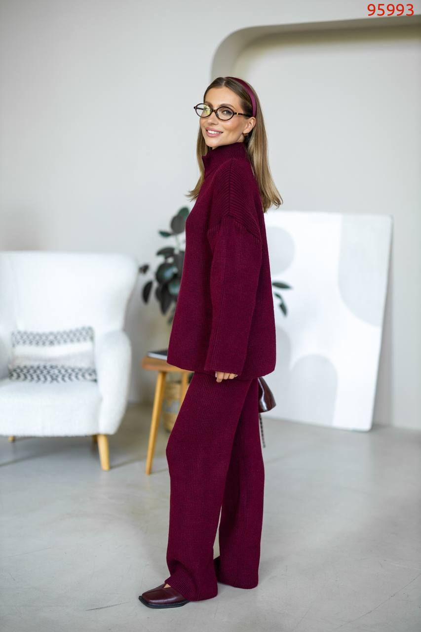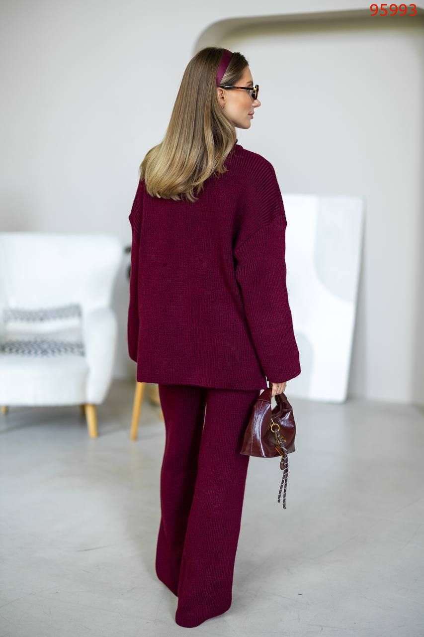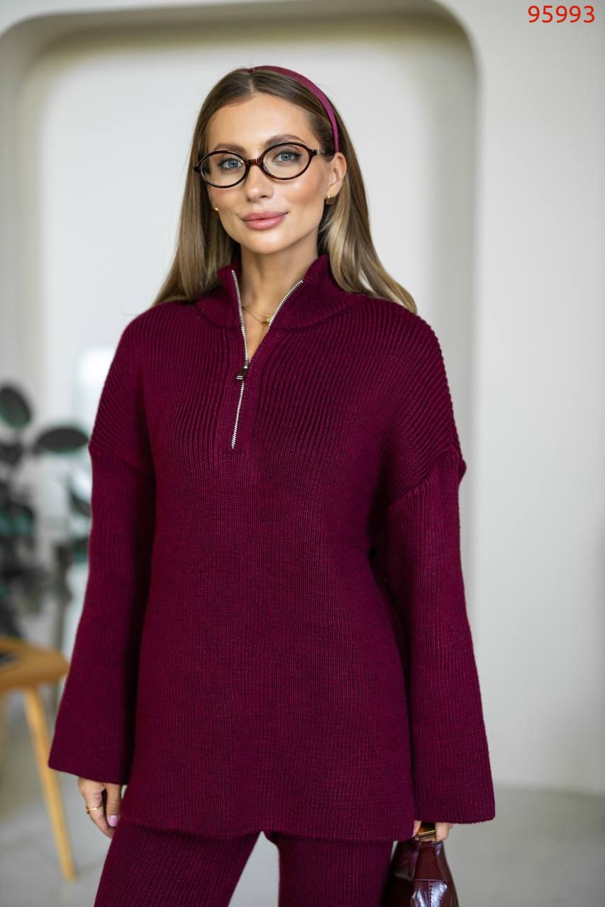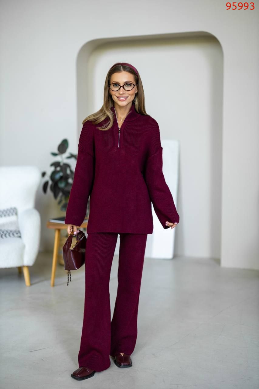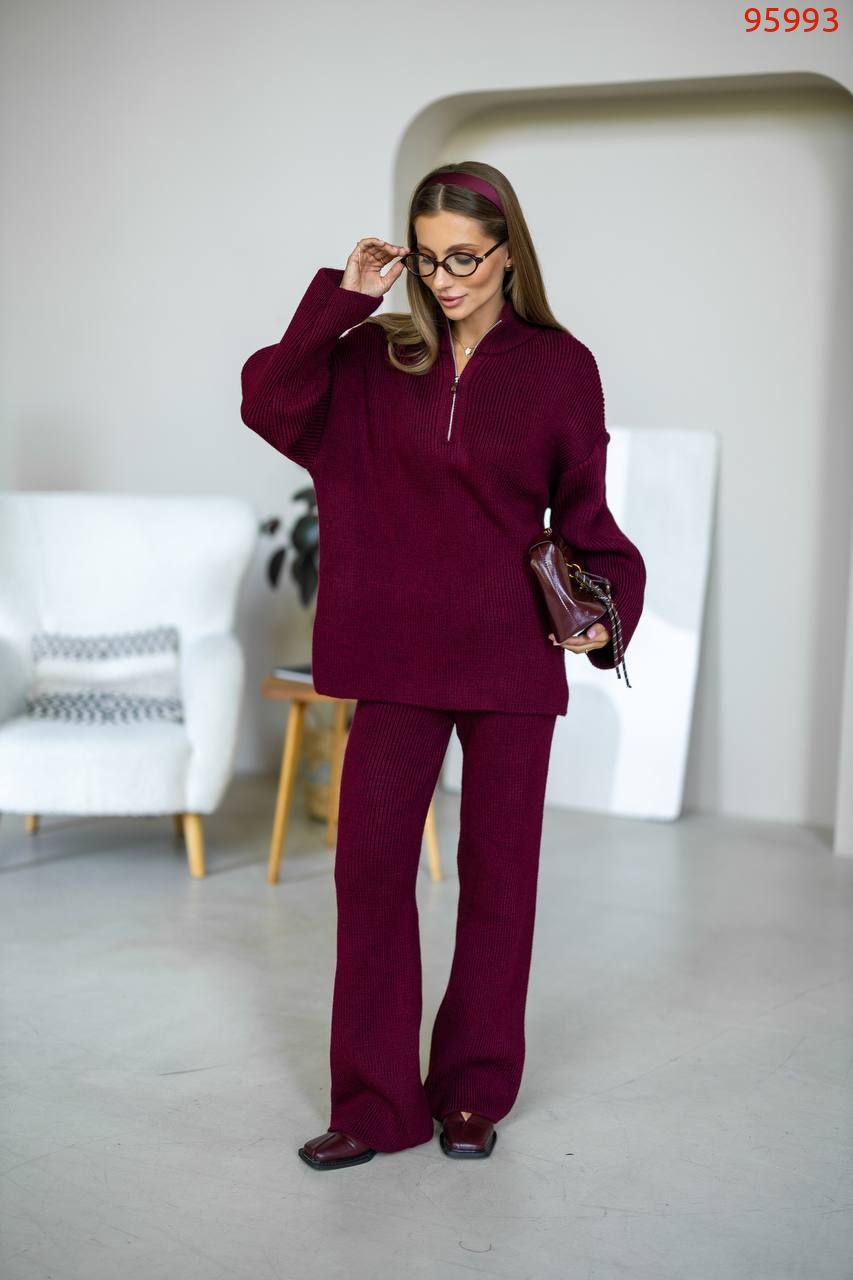Затишний костюм із м'якої щільної пряжі з ідеальною посадкою. Вільний светр на блискавці та прямі штани створюють стильний та розслаблений силует. Підходить для міста, подорожей та відпочинку.