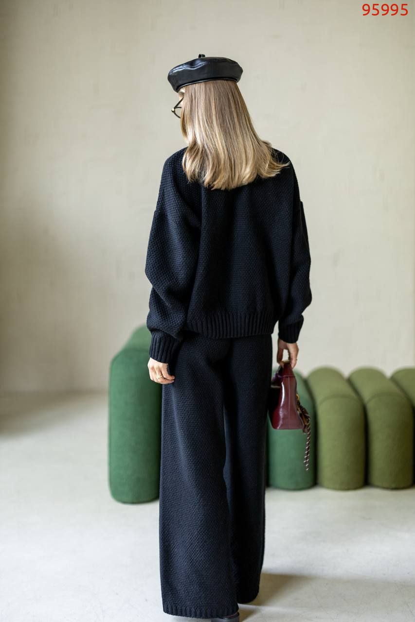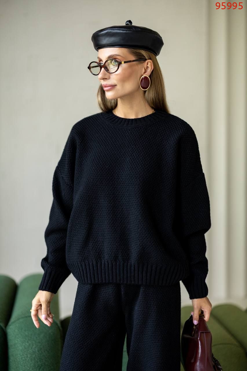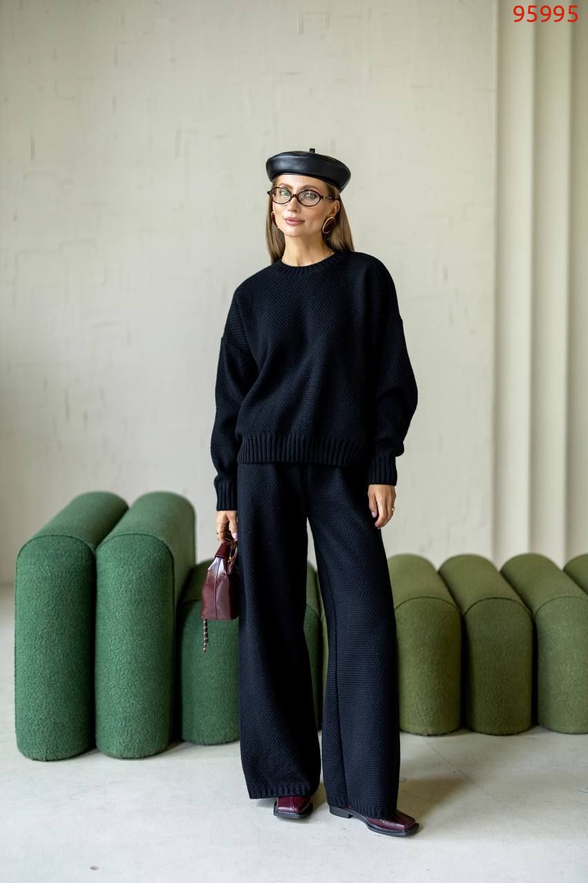 Затишний костюм із щільної фактурної в'язки з м'яким приляганням до тіла. Вільний светр та прямі штани створюють елегантний, розслаблений образ щодня.