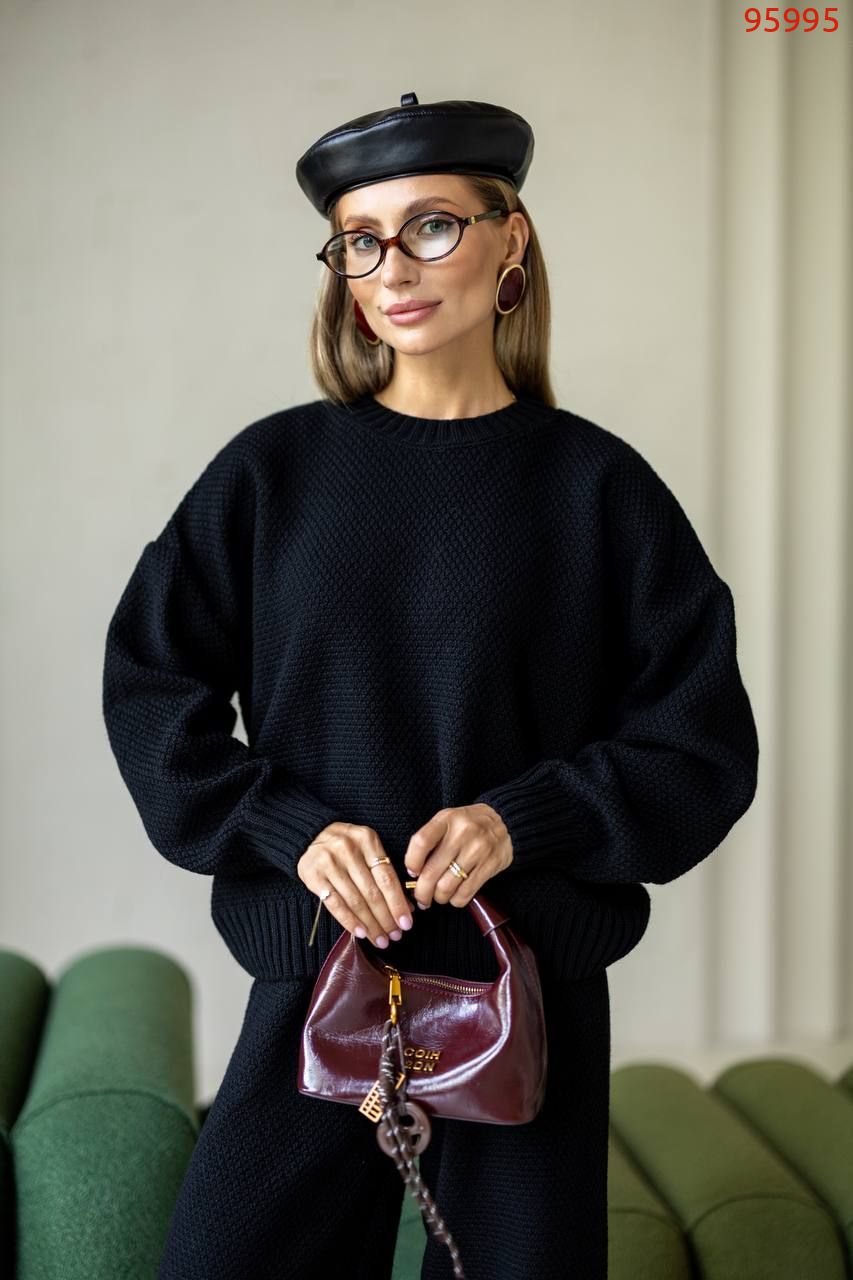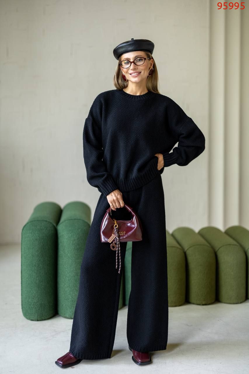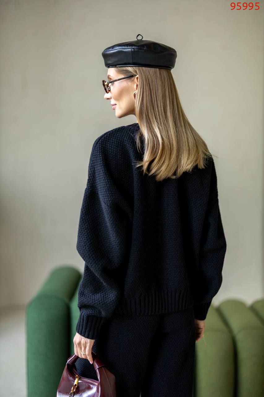 Затишний костюм із щільної фактурної в'язки з м'яким приляганням до тіла. Вільний светр та прямі штани створюють елегантний, розслаблений образ щодня.
