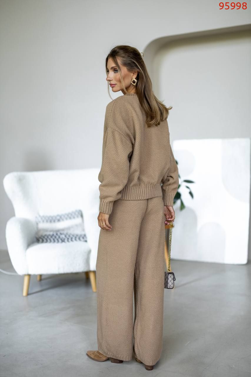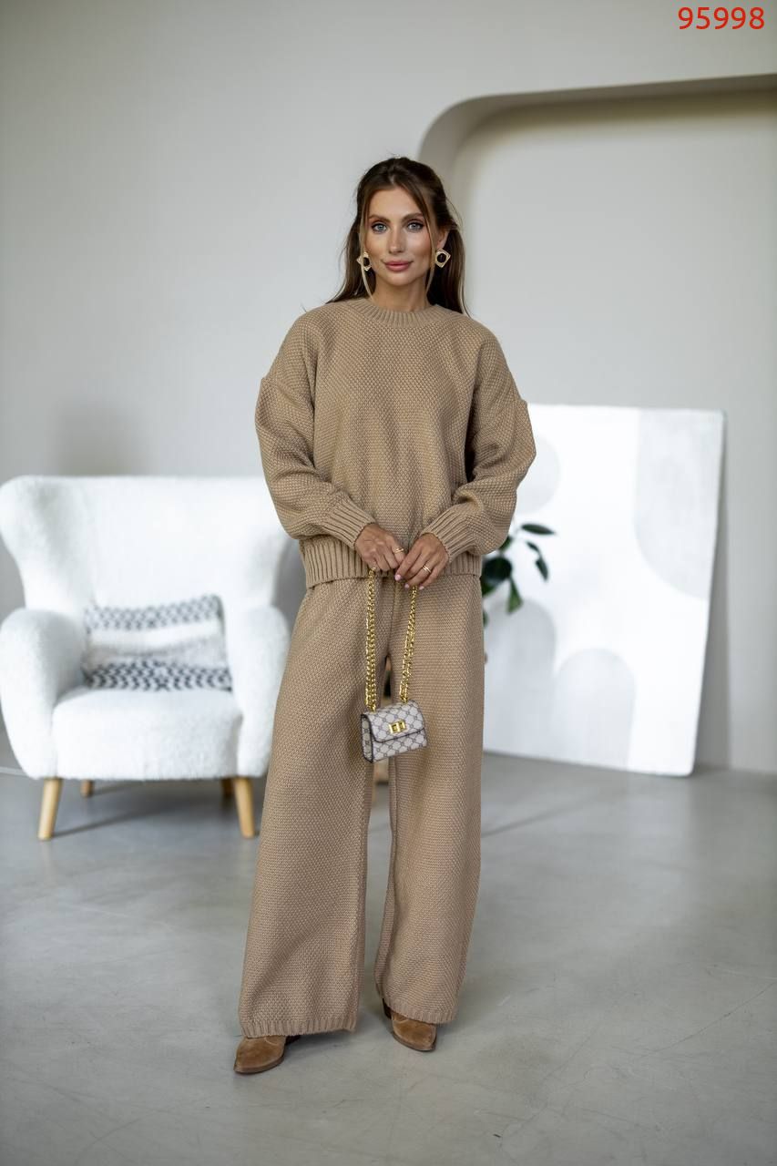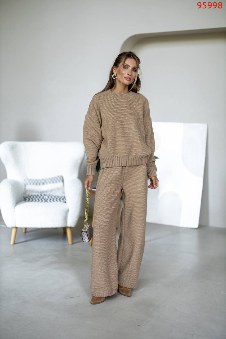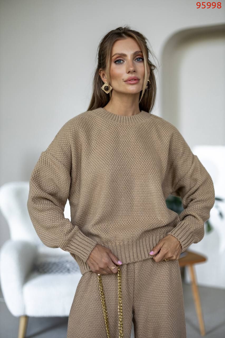Затишний костюм із щільної фактурної в'язки з м'яким приляганням до тіла. Вільний светр та прямі штани створюють елегантний, розслаблений образ щодня.