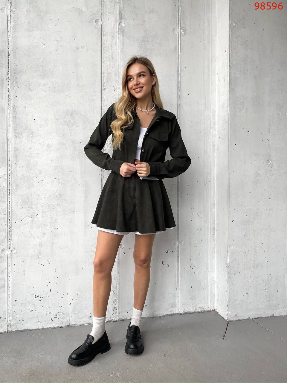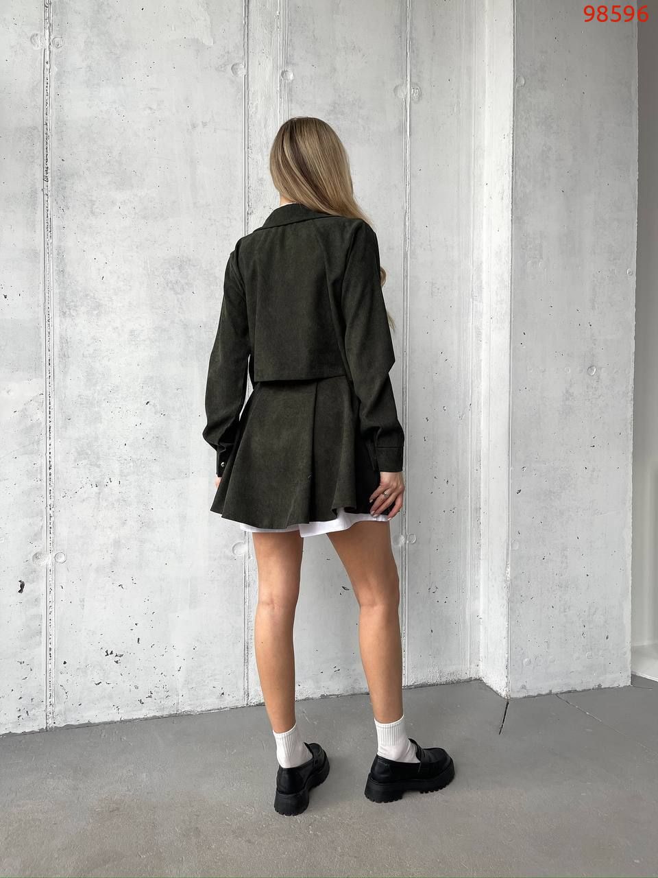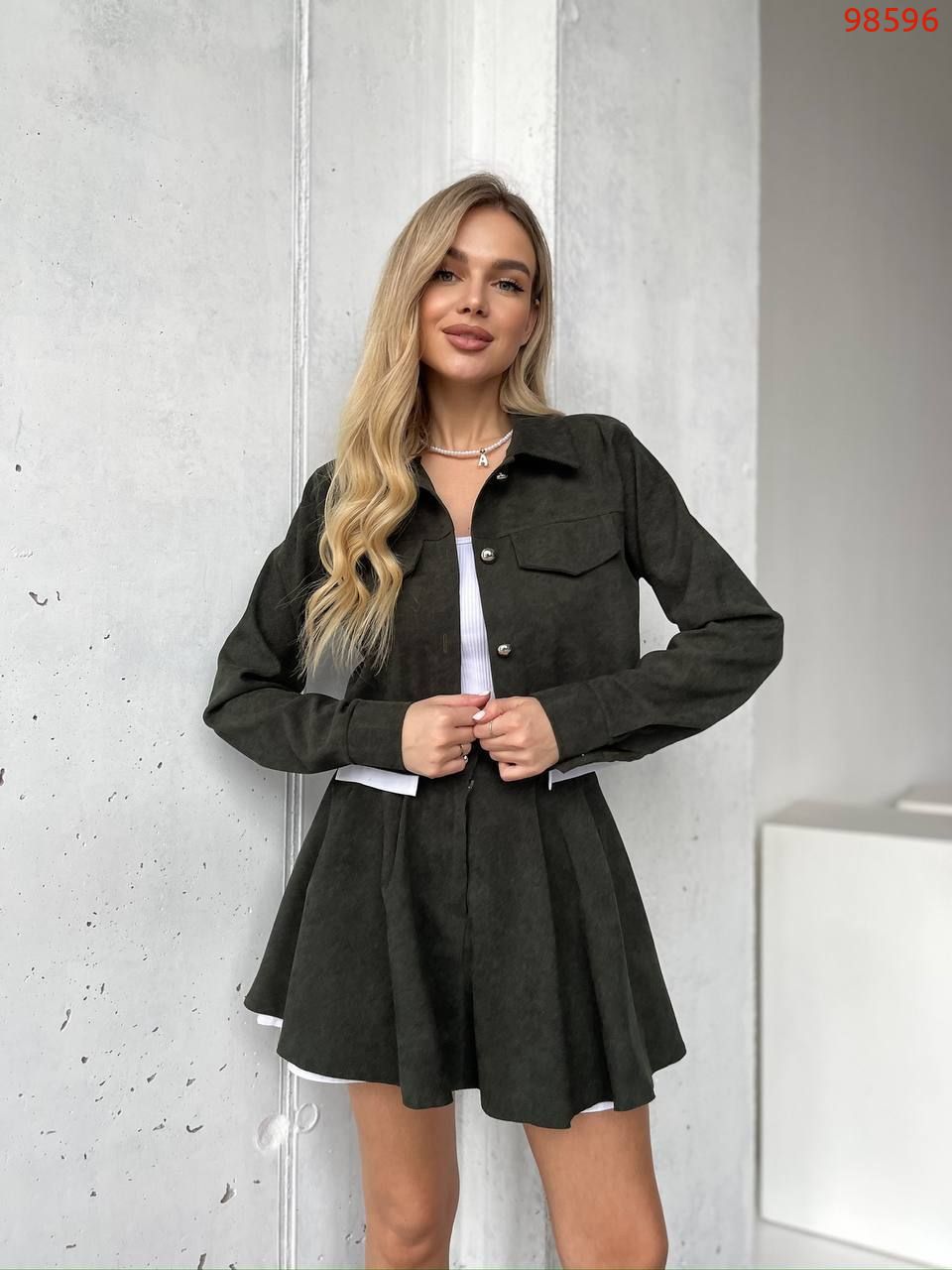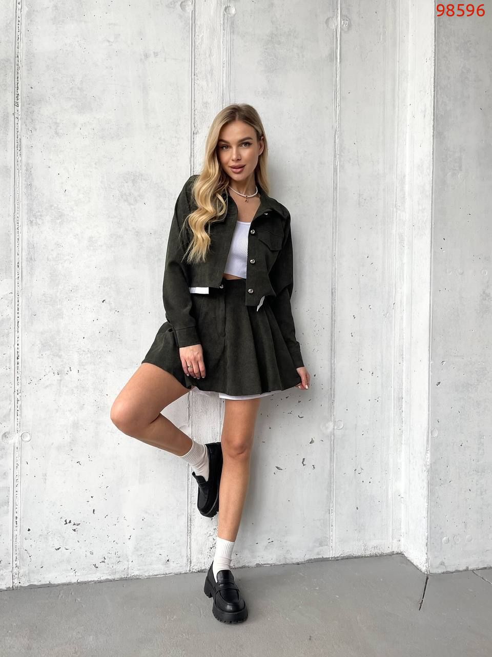 Костюм (жакет та спідниця-шорти) хакі №98596