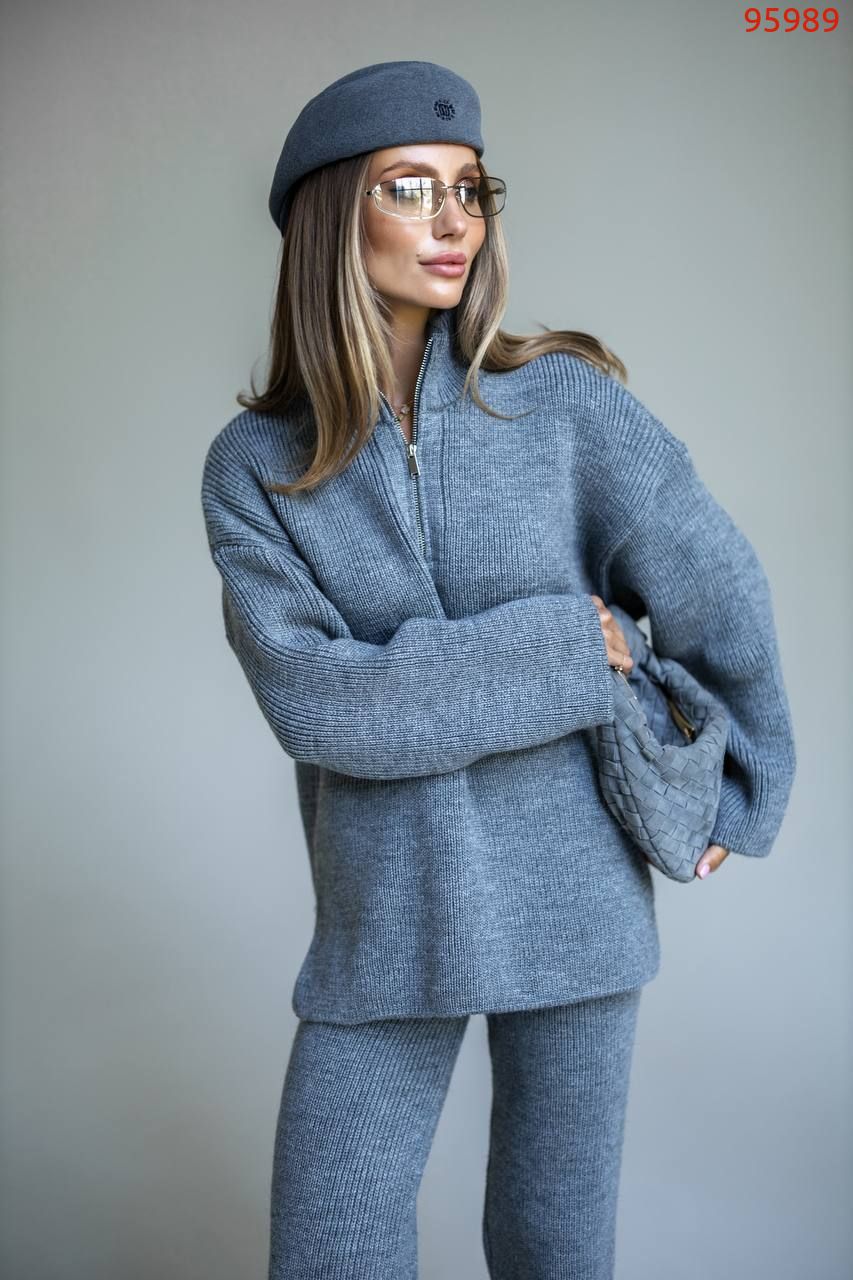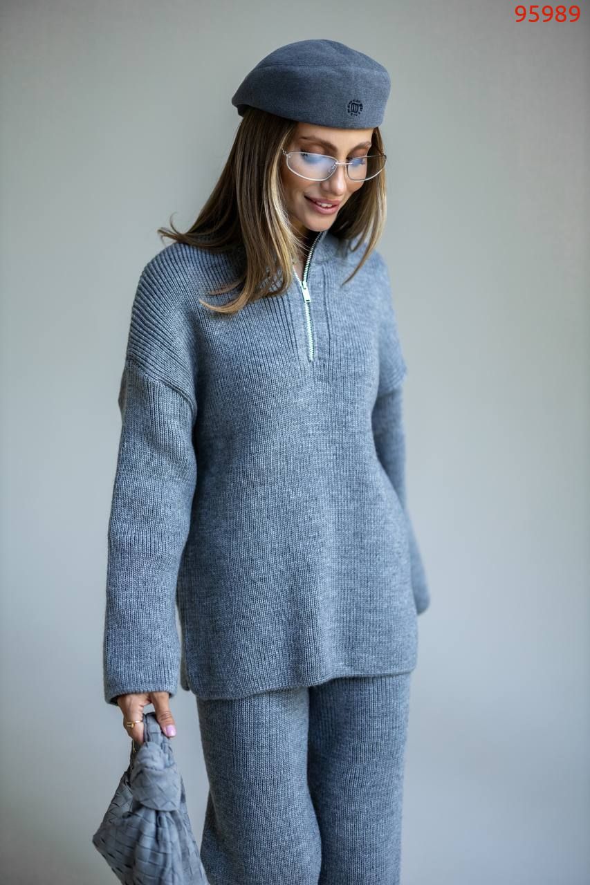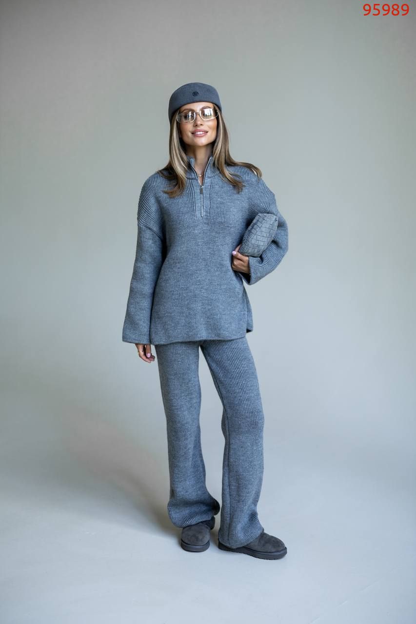 Затишний костюм із м'якої щільної пряжі з ідеальною посадкою. Вільний светр на блискавці та прямі штани створюють стильний та розслаблений силует. Підходить для міста, подорожей та відпочинку.