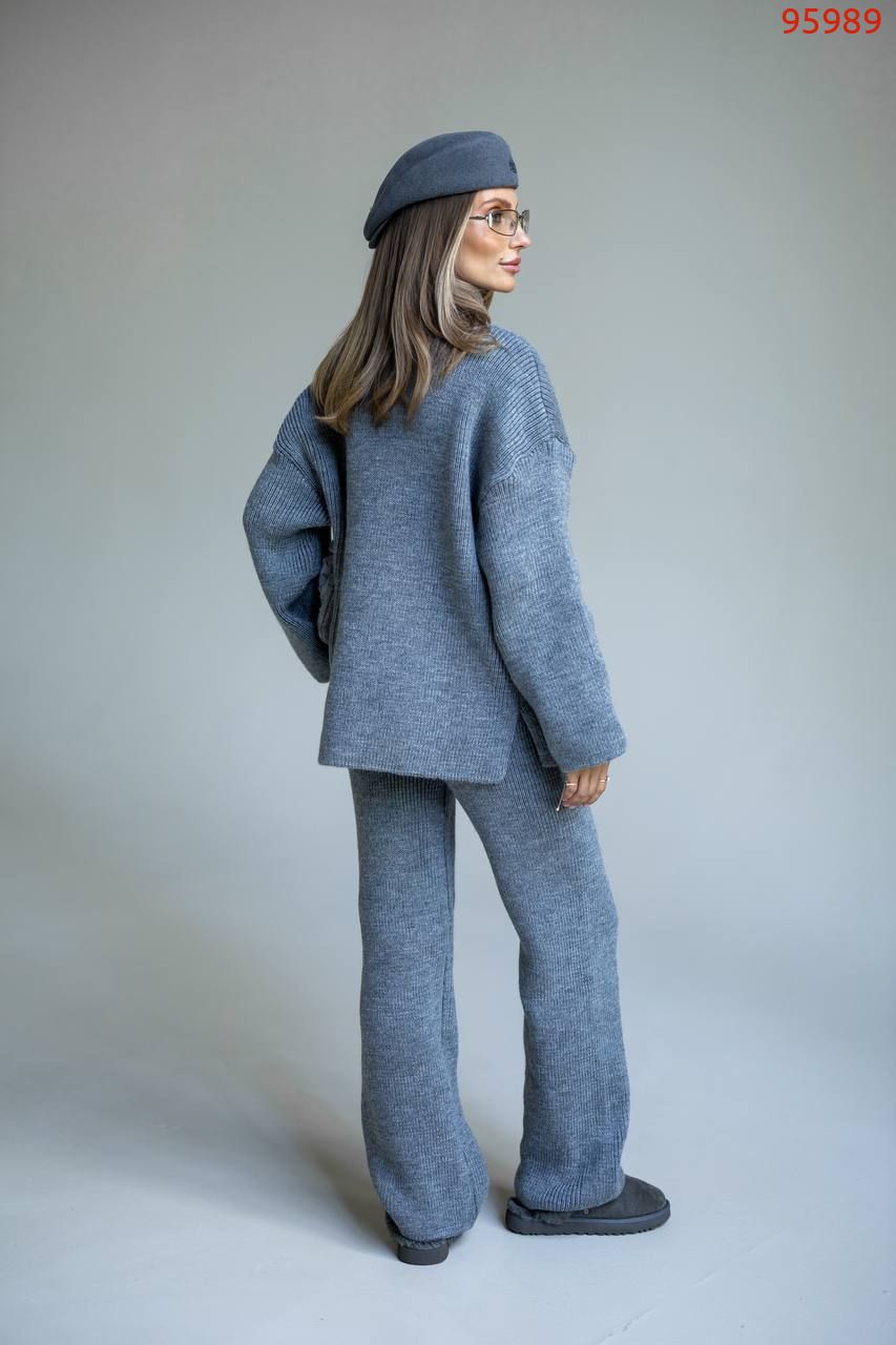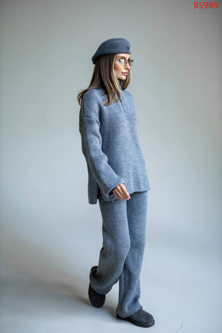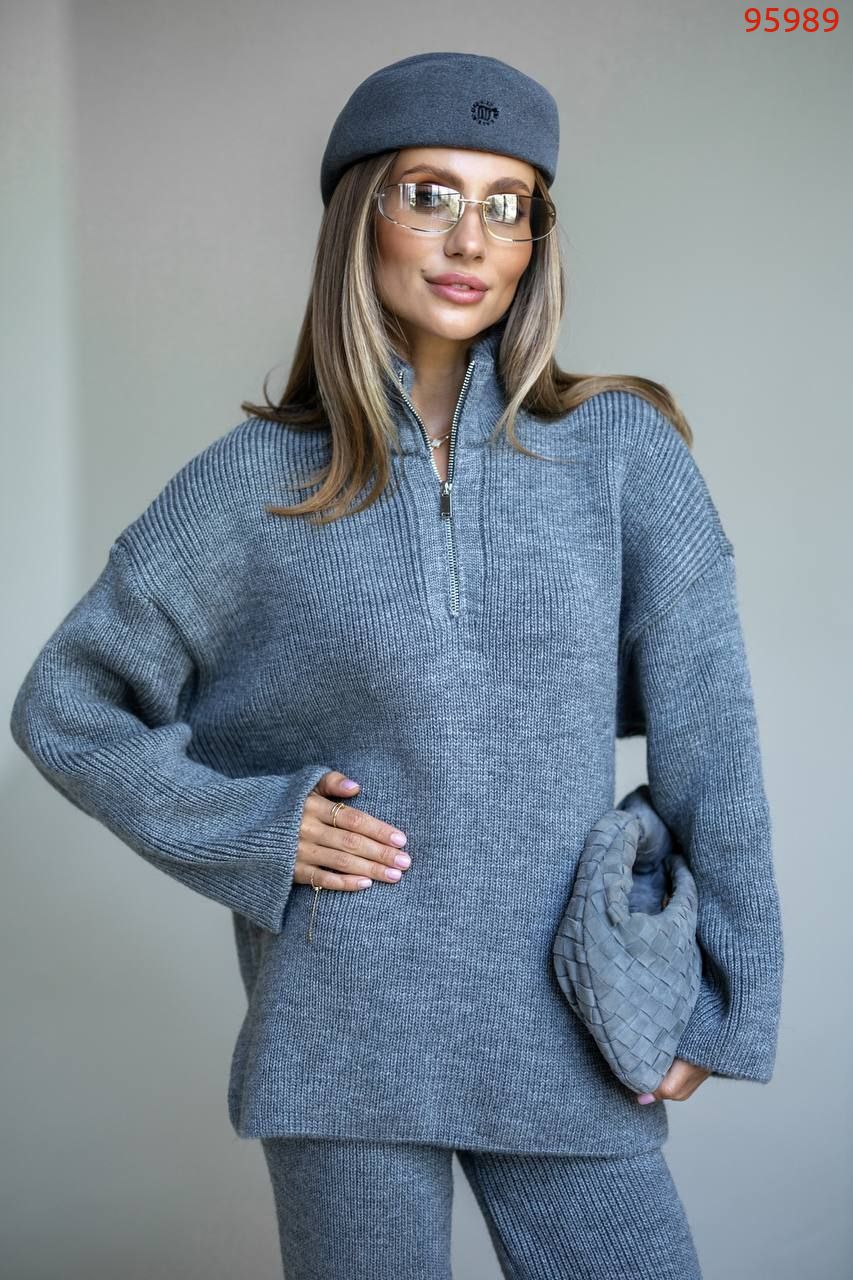 Затишний костюм із м'якої щільної пряжі з ідеальною посадкою. Вільний светр на блискавці та прямі штани створюють стильний та розслаблений силует. Підходить для міста, подорожей та відпочинку.