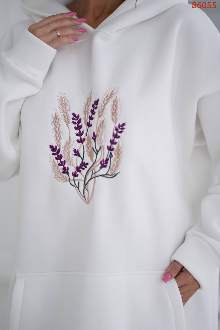 Подовжений худі вільного крою на флісі. М'яка тканина, приємна до тіла. Перед декоровано контрастною вишивкою. Є кишені, що діють.