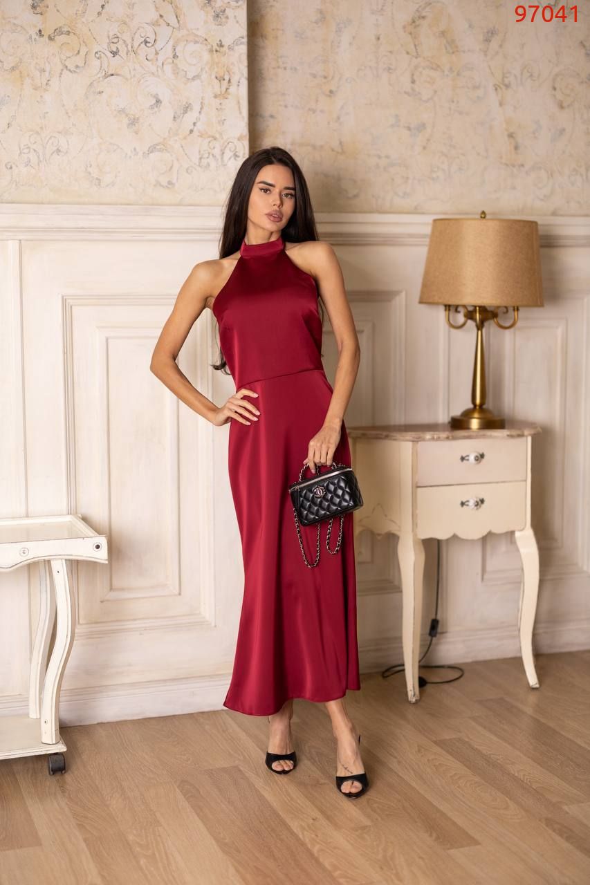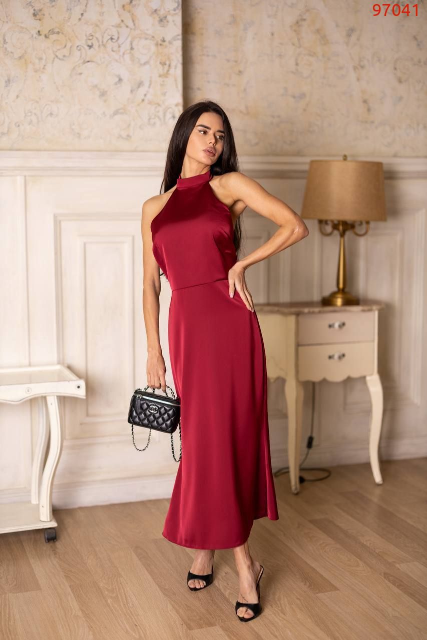 Елегантна шовкова сукня максі зі стійкою та акцентом на відкритій спині. Струменева тканина підкреслює силует, а зав'язки на шиї додають витончену деталь. Лаконічний крій робить модель ідеальною для вечора, зйомки або урочистого виходу.