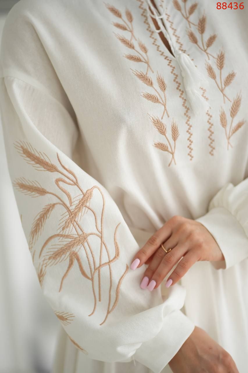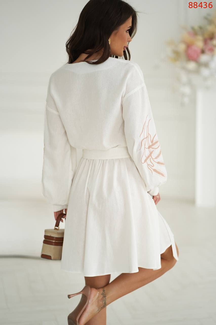 Льняна сукня з вишивкою та розкльошеною спідницею.