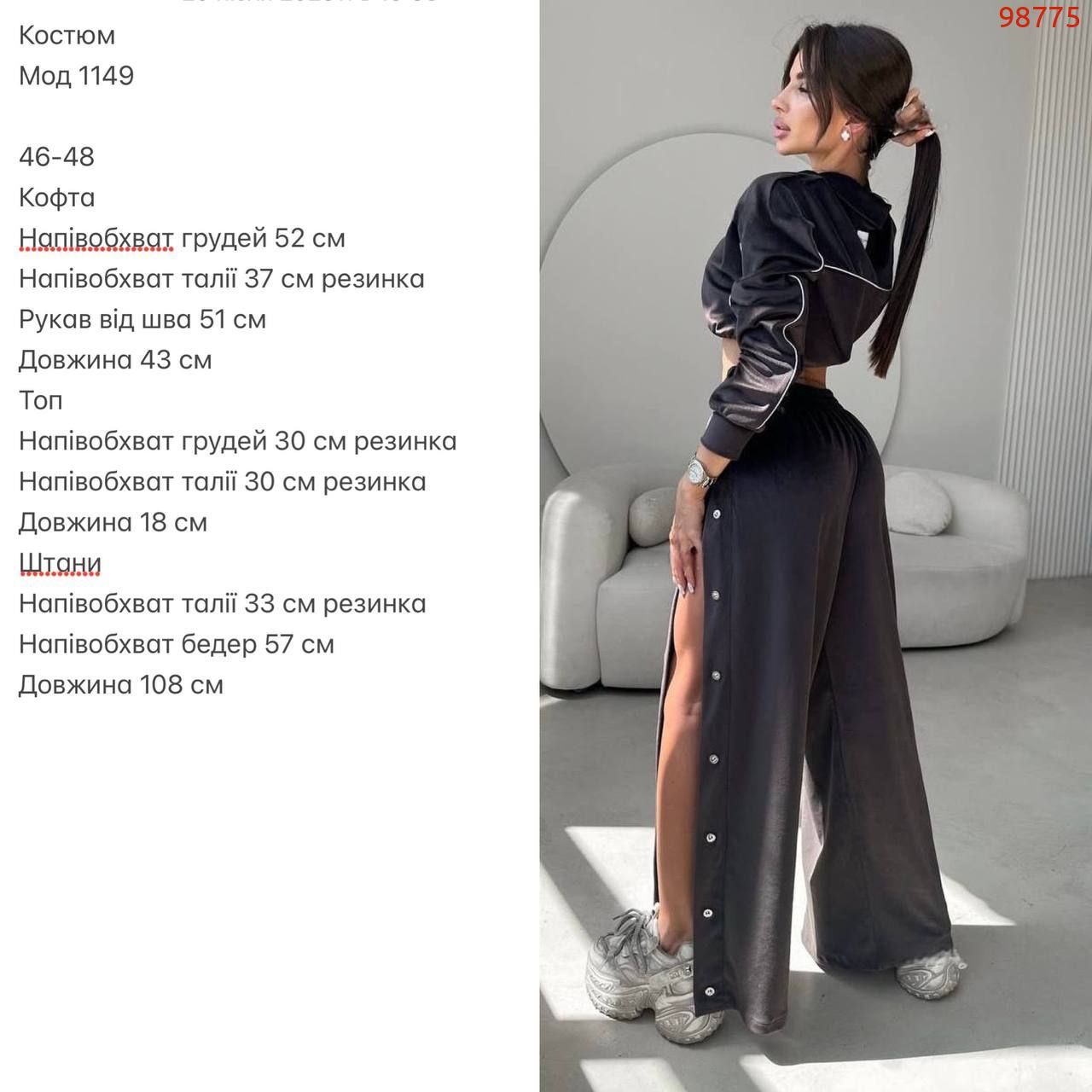 Ідеальний костюм з приємного мʼякого велюру. Складається з кофти, топу бандо та штанів на закльопках по боках. Кофта йде вкорочена на змійці, з кантом. Топ на резинці.