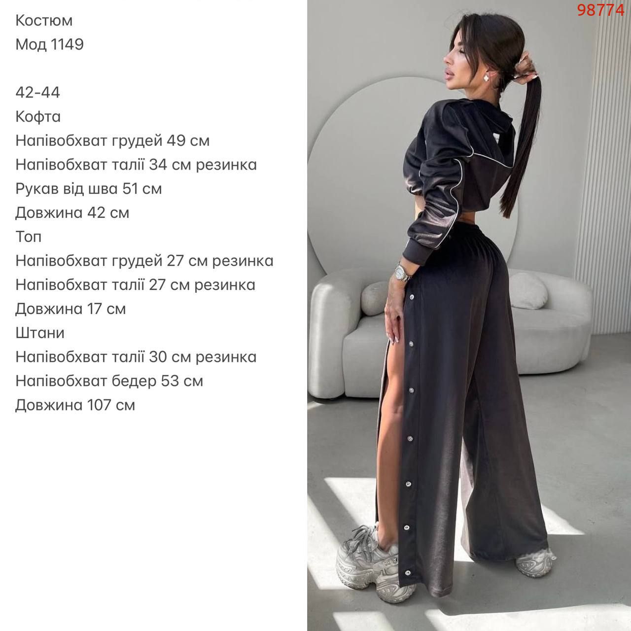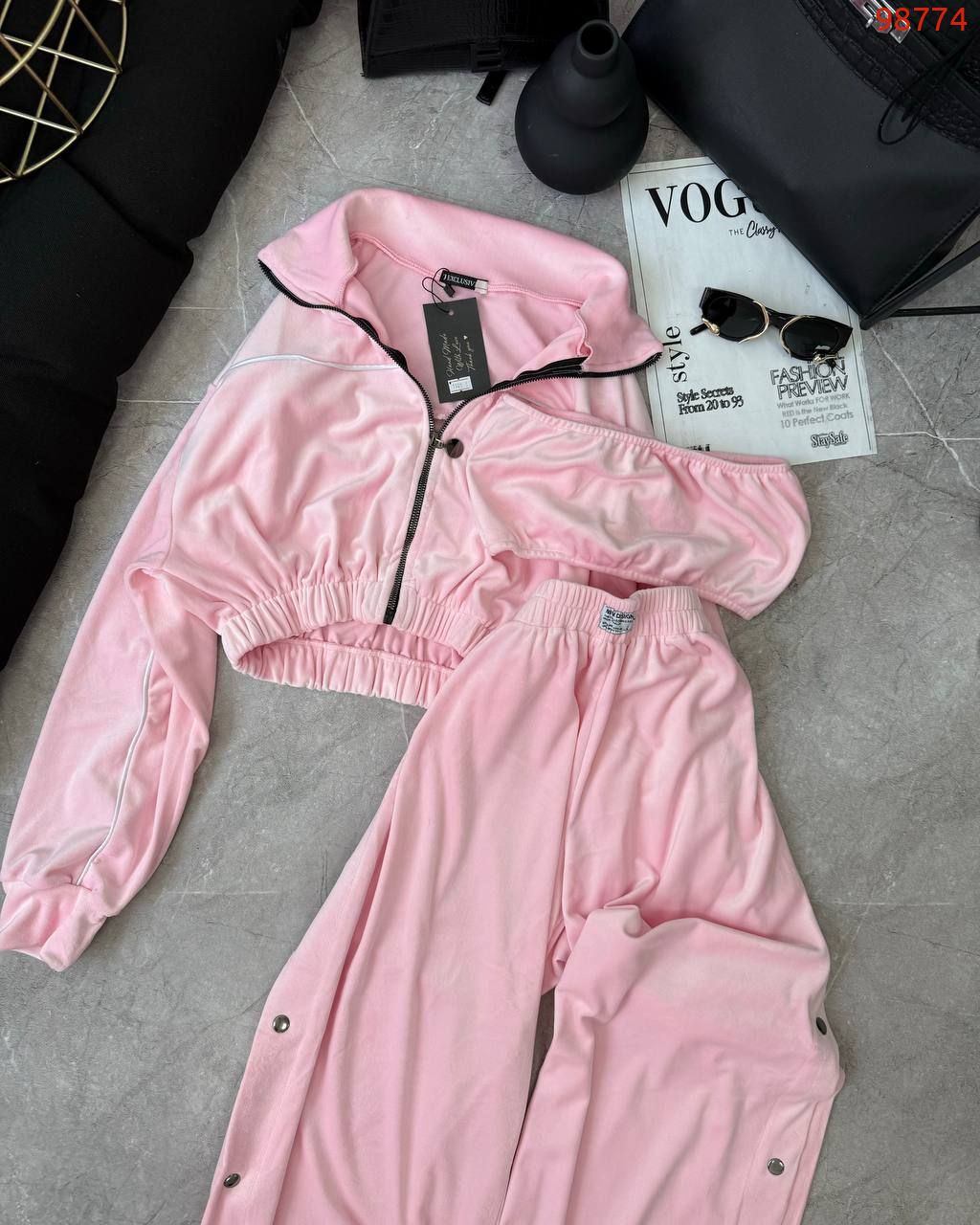 Ідеальний костюм з приємного мʼякого велюру. Складається з кофти, топу бандо та штанів на закльопках по боках. Кофта йде вкорочена на змійці, з кантом. Топ на резинці.